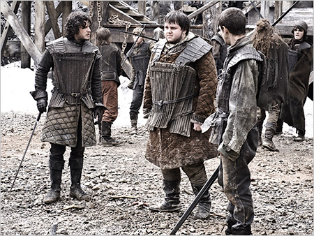 Джон Сноу, Сэмвелл Тарли и Пипар в стёганных тренировочных доспехах во дворе Чёрного Замка.