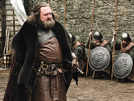 Роберт в Винтерфелле, у стены приседают несколько человек из охраны Старков с лютоволками на щитах.