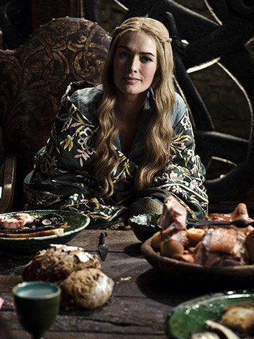 Серсея на пиру в Винтерфелле, восседает за грубым деревянным столом заставленным в основном мясными блюдами.