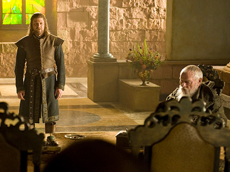 Эддард на Малом Совете в Королевской Гавани, рядом сидит Великий Мейстер Пицель.