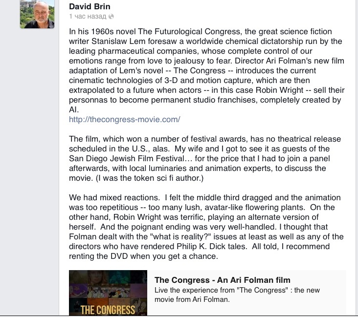 Вы здесь: Авторские колонки FantLab > Авторская колонка «Vladimir Puziy» > Дэвид Брин об экранизации "Футурологического конгресса" Станислава Лема |