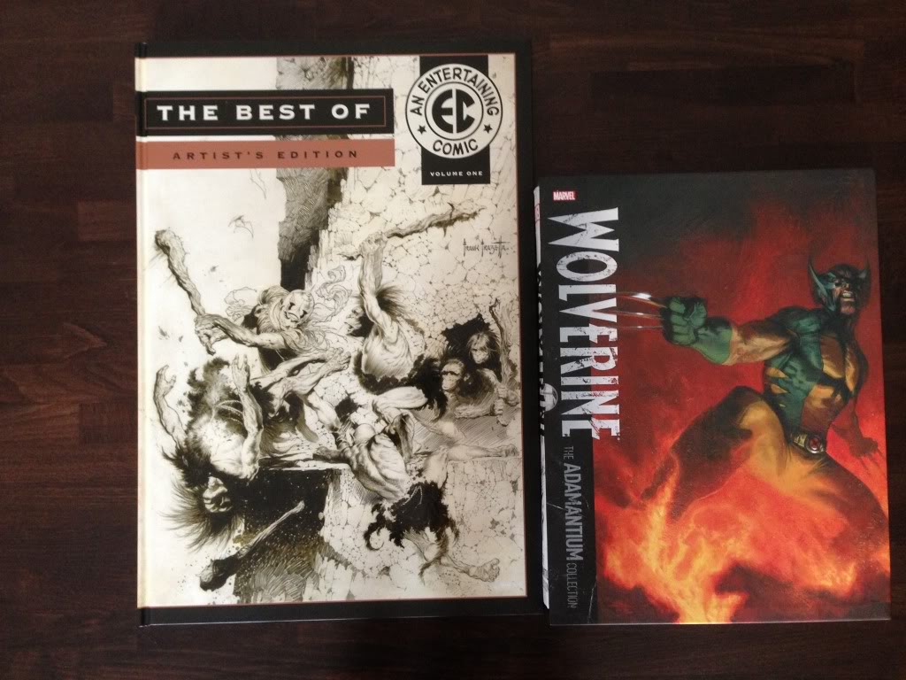 Как я уже сказал выше, проблем с переизданием комиксов было немного меньше, чем с переизданием стрипов, поэтому через какое-то время просто переиздавать стало недостаточно, т.к. все основное уже было издано, и соответственно надо было делать что-то особенное. Я не могу сказать со 100%-й уверенностью, что именно так и думали энтузиасты в IDW запуская серию Artist's Edition, но мне это кажется логичным. Так или иначе, серия Artist's Edition представляет собой репродукции оригинального арта выборочных работ известных художников комиксов. То есть без привычной обводки тушью и покраски. При этом все заметки на полях и прочее остаются. И все это выполнено в масштабе 1 к 1 c оригиналов, а так как комикситы рисуют исходники значительно больше того, что выходит из печати, то получившаяся книга — это здоровенный coffee-table-book. Я к каждой серии фотографий издания добавлял одну совместно с другой книгой, чтоб были представления о размере, а для тех, кому этого будет недостаточно, есть фото девушки выглядывающей из-за MAD Artist's Edition. Все Artist's Edition конечно немного варьируются по размерам, но в целом размер – это их существенная отличительная черта. Так же обычно туда добавляют различные допы, но подробности уже надо смотреть по каждому конкретному изданию. Сам я такими изданиями не обладаю, это для истинных ценителей с толстыми кошельками. Все-таки кавер-прайс у них упираются в 200$ (на деле получается 120-150+ доставка, что все равно много). А теперь немного конкретики о каждом издание. Начну с тех, что не Artist's Edition, а потом уже к ним вернусь, т.к. очевидно, что, как и в предыдущие года три, именно одно из них заберет приз. Canteen Kate — это переиздание своеобразных военных комиксов золотого века Мэтта Бейкера с женскими главными героинями. Сюда попало, скорее всего, из-за имени автора, довольно известного в узких кругах, нежели из-за самого издания, на которое на амазоне ни одного сугубо положительного отзыва. В целом такая же беда с переизданием одного из немногих взрослых журналов Джека «Короля» Кирби — In the Days of the Mob — о гангстерах, которые в свое время были закрыты DC, еще фактически до попадания в открытую продажу, т.к. компания передумала рисковать и играть в обход Комикс Кода. DC вообще со своими переизданиями не дружат, так что и тут, судя по отзывам, работа довольно халтурная, сделанная больше ради того, чтоб срубить бабла на известном имени. Самым спорным решением в издание, как я понял, является замена привычной черно-белой палитры на сепию, чтоб скрыть несовершенство некоторых исходников. А теперь собственно о представленных Artist's Edition. Best of EC, как видно из названия, является первым томом сборника лучших работ отчасти печально известного издательства EC Comics, т.к. во многом именно благодаря ему и был введен пресловутый Комикс Код, а из-за него в свою очередь уже потом издательство и приказало долго жить. Чтобы немного скорректировать координаты тех многих, кто не в теме, добавлю, что именно EC выпускали известные во всем мире благодаря экранизациям Байки из склепа. Но помимо этой серии у нее было еще и множество других, над которыми трудились отличные художники и авторы. MAD, кстати, как раз и является одним из журналов EC, только на этот раз более юмористической направленности. Последним изданием по списку, но далеко не по значимости, здесь у нас идет Will Eisner's The Spirit, один из самых известных коми