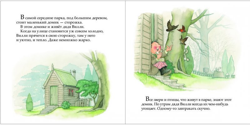 Аннотация. Дядя Вилли работает сторожем в старом парке. И домик его, сторожка, стоит тут же, под большим деревом. Вилли дружит со всеми зверьками, что живут в парке, и часто угощает их чем-нибудь вкусным. Но в морозную зиму четвероногим не только голодно, но и холодно. Однажды вечером ударил сильный мороз, повалил снег. Не успел дядя Вилли уютно устроиться под одеялом с чашечкой горячего какао, как в дверь постучали. Это была белка — она замерзла и вся дрожала от холода. Добряк Вилли охотно впустил ее к себе в дом, но вот ведь какое дело — вслед за белкой один за другим пожаловали зайцы, лиса, барсук, две утки, еж и целое семейство мышей! Вилли в затруднении: как разместить всех гостей и никого не обидеть?