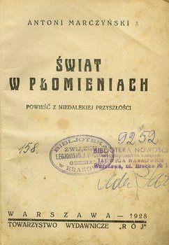 (Ох уж мне этот Марчиньский. Он был неутомимым и неисчерпаемым бульварным писателем (написал и издал 41 роман в 1927 –1939 годах). Мог писать по несколько романов в месяц и никогда не скрывал того, что занимается этим исключительно ради денег. Как правило, прежде печатал написанное в газетах и журналах, затем выходили в свет книжки – чтобы их издавать, в 1931 году основал собственное издательство. А еще надо учесть разбросанные там и сям несколько сотен рассказов, очерков, заметок, рецензий и пр. и пр. Просто бездонный кладезь для того смельчака, который решится составить его биобиблиографию для ФАНТЛАБа. Вот тут кроме одной из названных книг НФ еще парочка из не названных: «Газ 303/Gaz 303» (1931) и «Мир в огне/Świat w plomieniach» (1928). В первой -- гады-большевики изобрели жутко ядовитый газ, которым чуть было не потравили всех поляков. Во второй Польша воюет с коммунистической Россией, Румыния – с Финляндией, Германия – с Бельгией и Францией, Югославия – с Венгрией, и вообще все воюют со всеми.