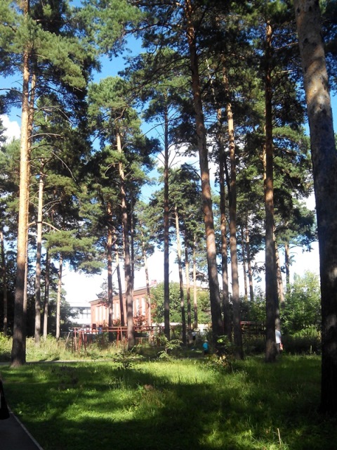 А после белок я побегала по маленькому парку — там закатана асфальтом дорожка, круг на глаз, наверное, метров 150. Сосны, крапива, голубое небо и завлекательного вида спортплощадка: