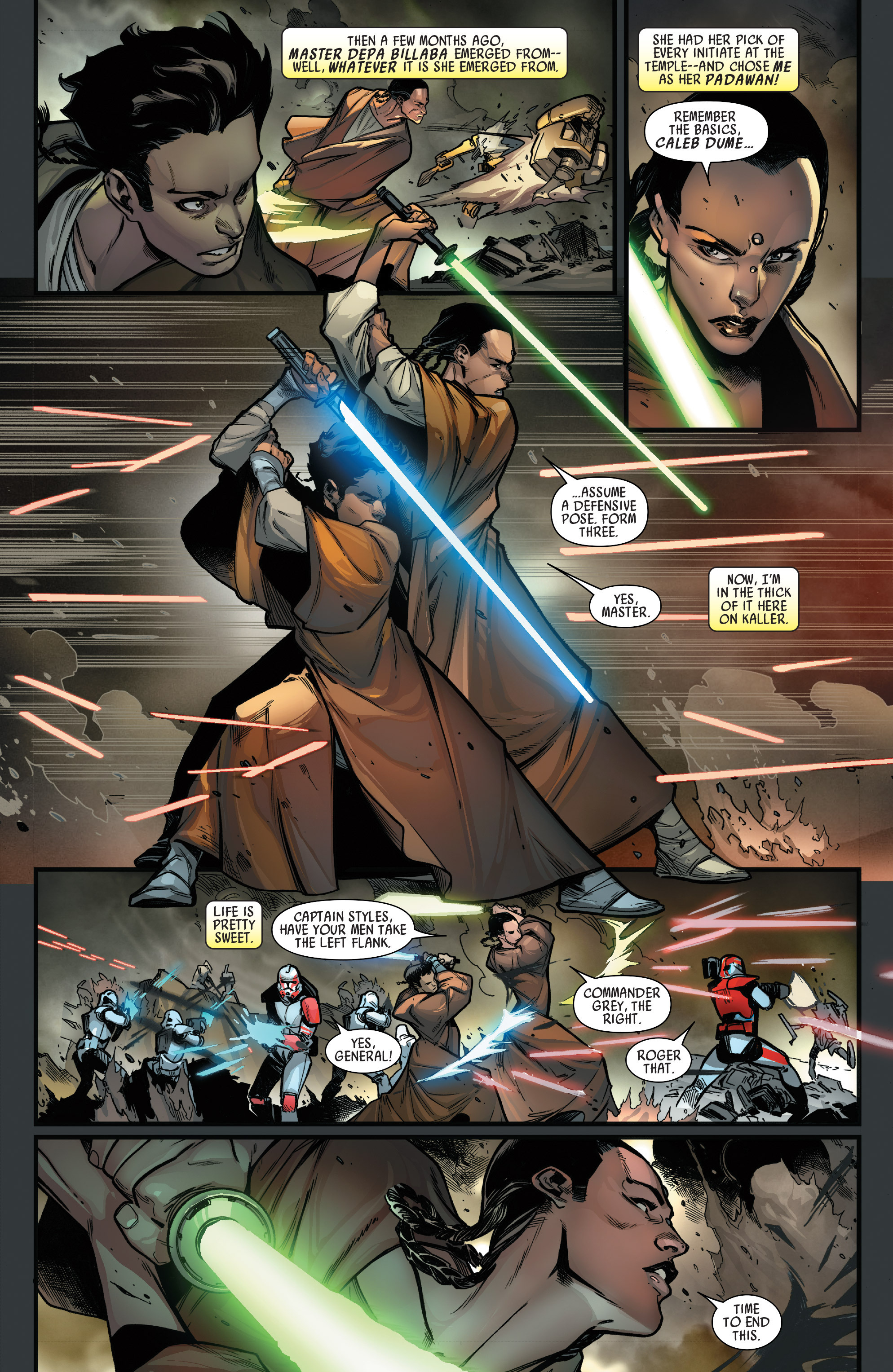 Возвращаясь к Кейнану — этот сюжет мне понравился тем, что по сравнению со всеми предыдущими комиксами, он смог зацепить меня историей и героями, а не информацией по канону или рисунком. Уже с первого выпуска легко симпатизировать персонажу, который в молодости немного напоминает Энакина, в том смысле, что не всегда идет по заветам Джедаев и задает кучу вопросов, чем постоянно смущает и злит многих падаванов и учителей. Причем его наставник — Депа Биллаба, отчасти, напоминает Квай-Гона по характеру, и тоже раздражает многих джедаев в храме своими нестандартными методами и эмоциональными вспышками.