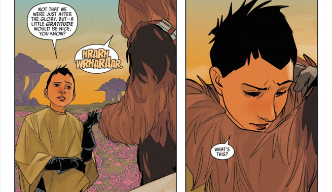 В общем-то и все. Комикс очень прост и прям, а его эмоциональная составляющая уверенно стремится к нулю. Антагонист мелок и показан весьма неинтересно. Зарро тоже не блещет характером и служит скорее инструментом для умиления читателя, активно и по любым поводам обнимаясь с мохнатым Чубаккой. По большому счету, весь комикс построен на такого рода попытках умиления, в духе: «Он им помог и теперь они будут сражаться вместе». Главным дополнением к канону в этом комиксе я бы назвал то, что Чубакка