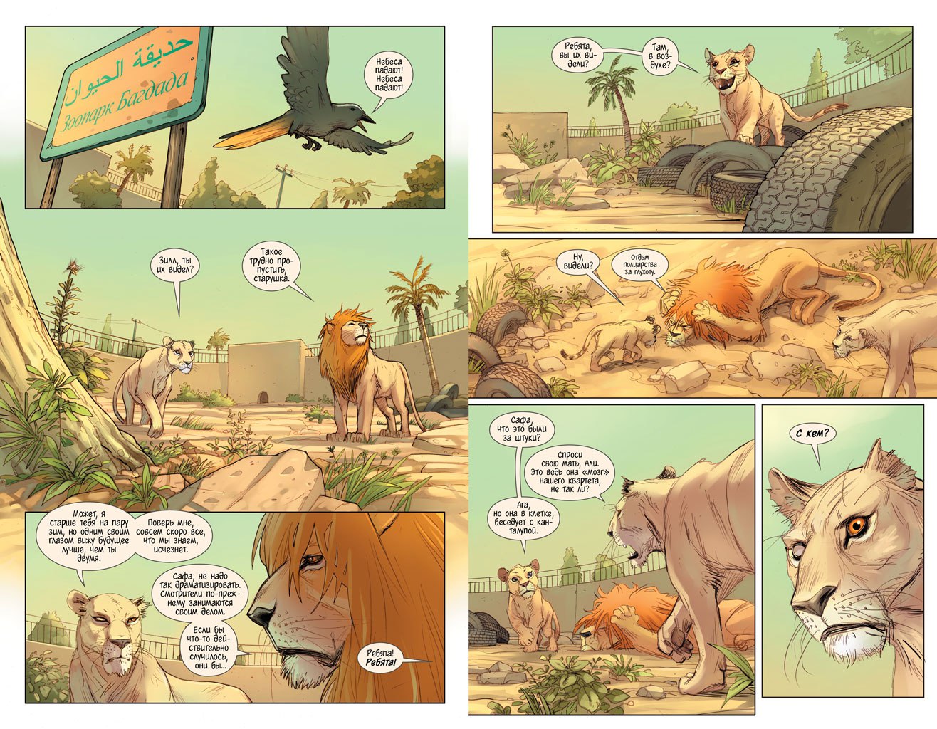 цитатаВ апреле 2003 года прайд львов выбрался из Багдадского зоопарка во время бомбардировки города американцами. Вдохновленные этими событиями, писатель Брайан К. Вон и художник Нико Анришон открыли необыкновенное окно в жизнь природы во время войны и показали цену выживания на фоне поразительно правдоподобной истории войны в Ираке. Описывая бедствия, свалившиеся на багдадских львов, эта непростая история затрагивает саму суть понятия «свобода». Можно ли получить ее из чужих рук, или ее можно добыть лишь собственными силами и самопожертвованием?
