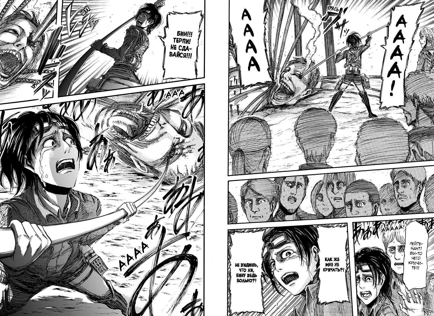 цитатаС помощью Эрена, умеющего превращаться в титана, людям удается вернуть район Трост и обезопасить стену Роза. Закрыв пробоину огромным камнем, Эрен теряет сознание, а приходит в себя в тюрьме и выдерживает допрос командира разведкорпуса Эрвина Смита. Тот принимает решение отправить экспедицию к дому отца Эрена, где, возможно, хранится тайна титанов. Но в этом непростом деле потребуется участие самого Эрена.