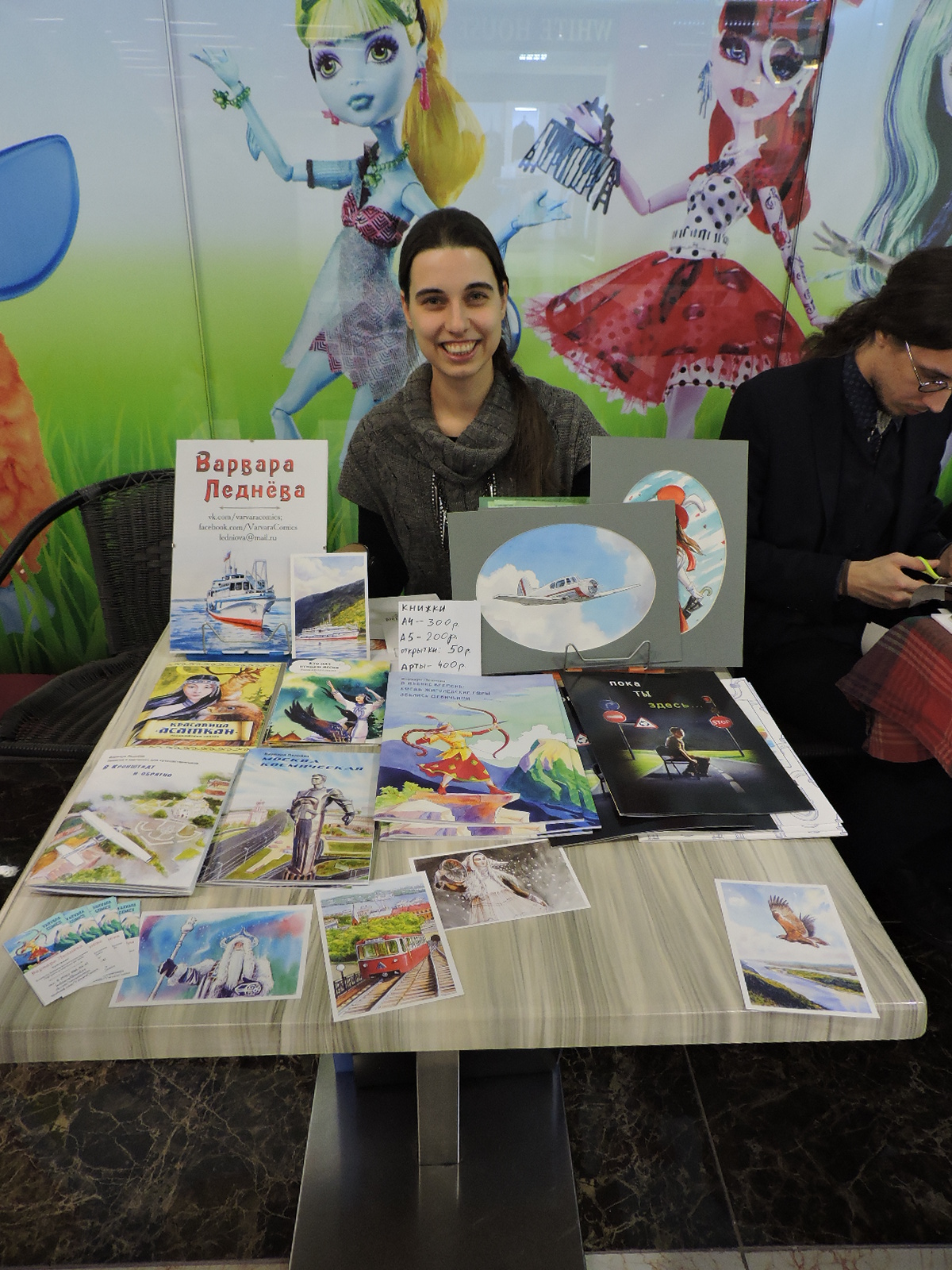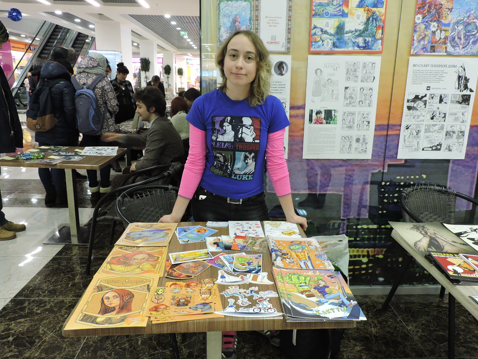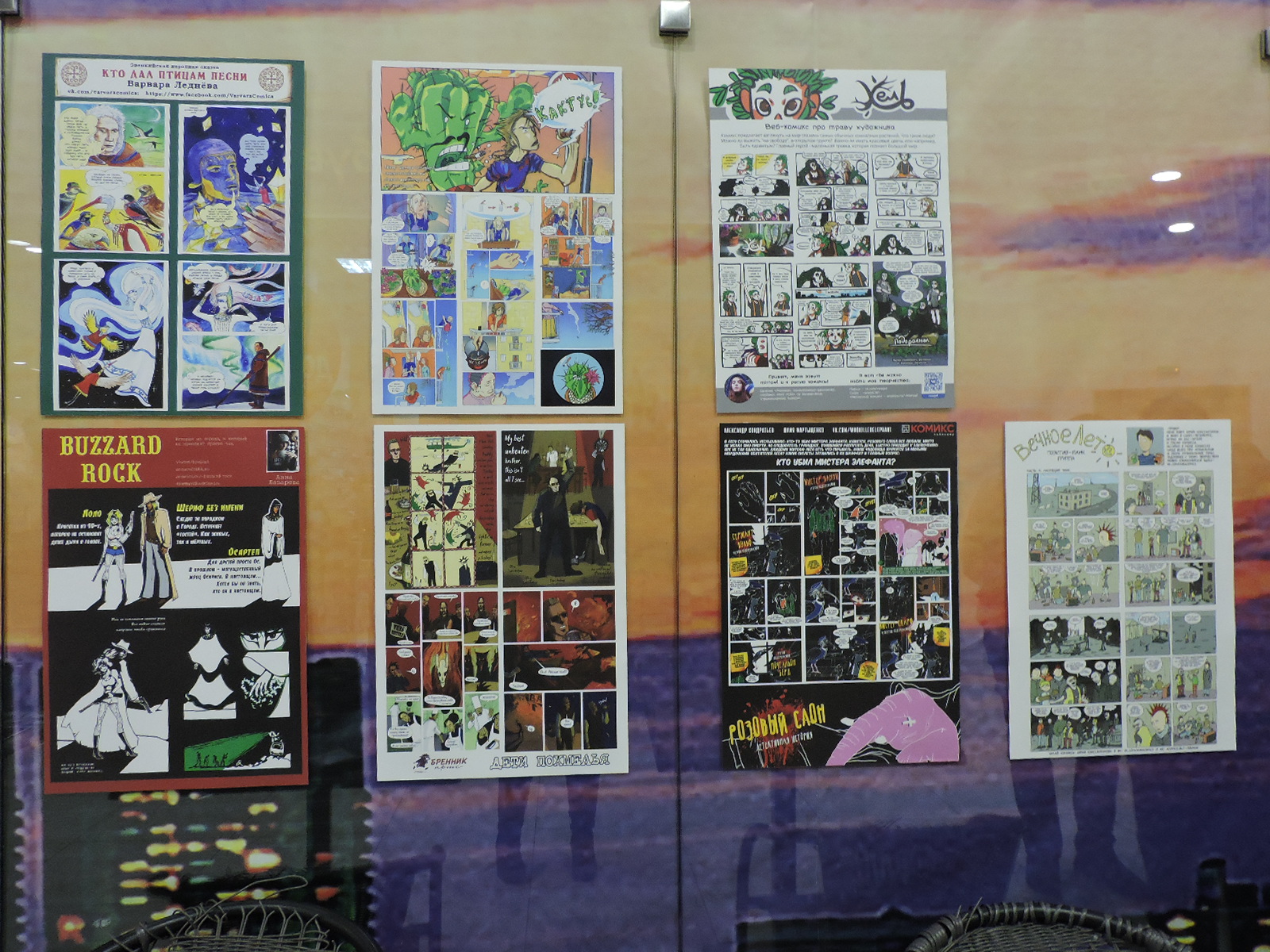 Первое, о чем хотелось бы рассказать — аллея авторов, которая оставила самые лучшие впечатления и с которой я увезла большую стопку комиксов. Ольга Федотова очень заинтересовала как комиксом «Тропа дворфов», написанным в соавторстве с Наташей Соло, так и сольными работами «Собачьи хлопоты» и «Кактус». «Тропа дварфов» представляет собой фэнтези-историю из трех выпусков, небольшую, но с забавными героями и хорошим сюжетом. Настя Стриж — автор из Казани, и если вы читали мой отчет о Плутоне, то именно она нарисовала мне Капитана Америка. В рамках этого фестиваля приобрела у нее несколько открыток. Варвара Леднёва — автор, прежде всего заинтересовавшая комиксами по эвенкийским сказками и легендам (я очень люблю такое), а после более подробного знакомства с ее работами, я приобрела несколько открыток и комикс «Москва космическая», рассказывающий о местах в Москве, связанных с космосом с указанием адресов и метро. Анна Лазарева — организатор фестиваля и автор серии комиксов о городке Buzzard Rock. Творческое объединение «Бренник-Артс» уже было мне известно по циклу «Chapiteau. Одним богом больше» и комиксам «Дети похмелья» и «Наказание», была рада увидеться с авторами лично. Также на аллее авторов располагалась и небольшая выставка работ.