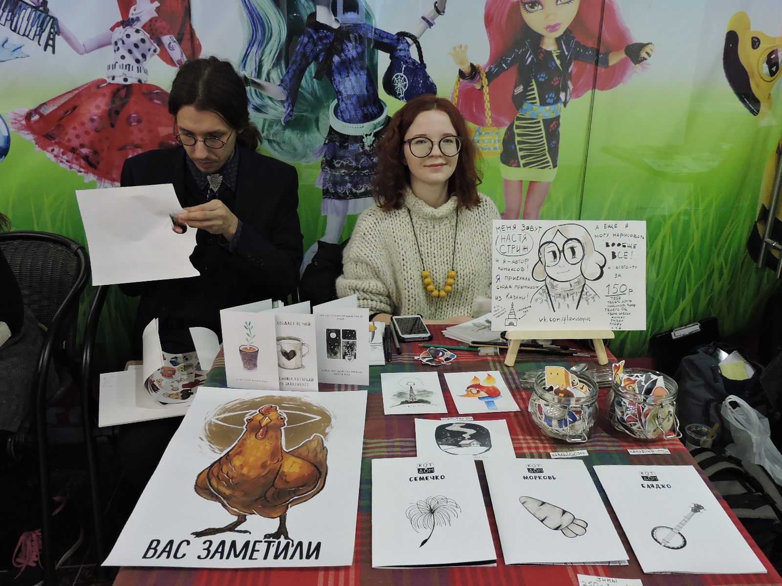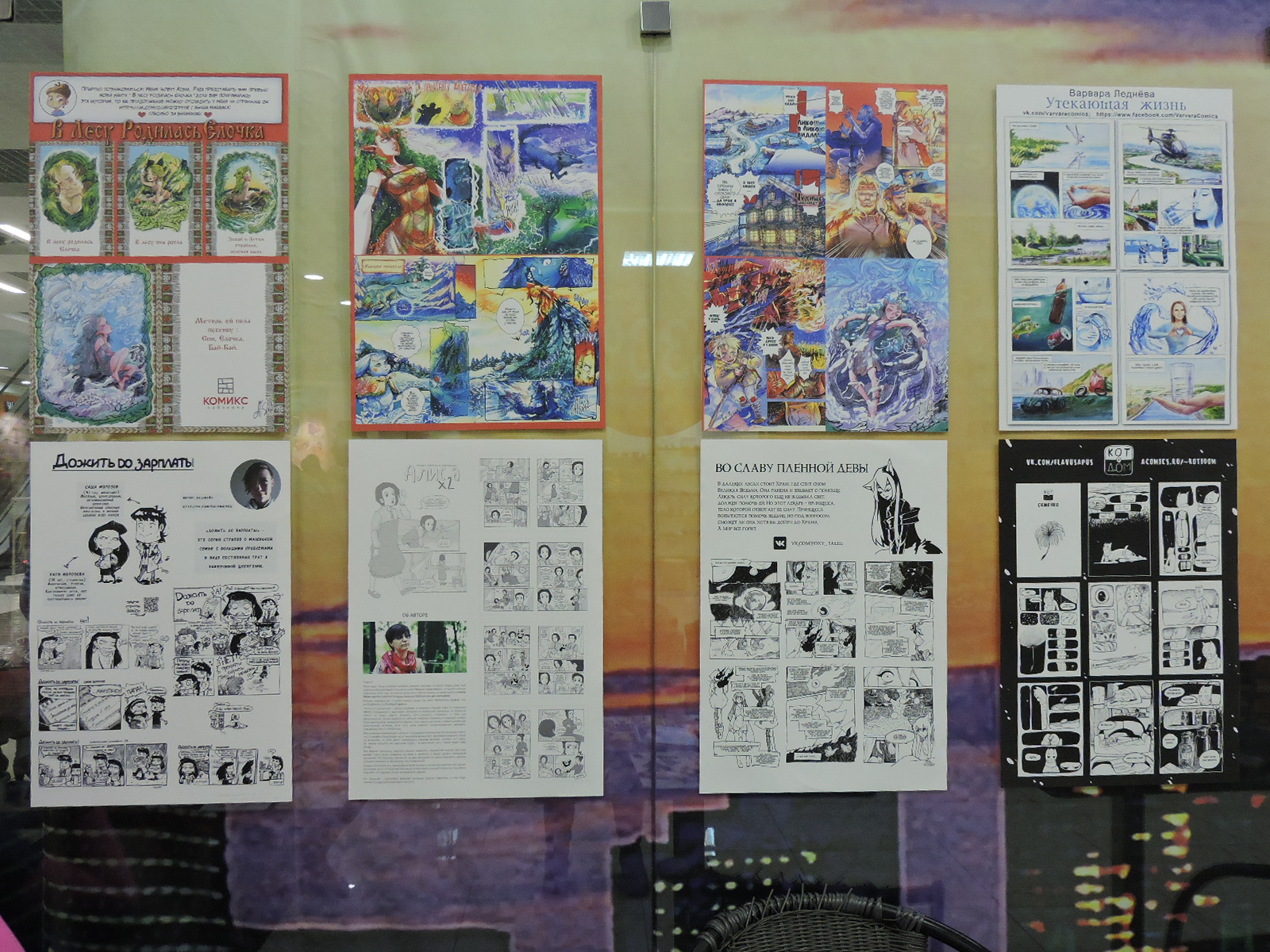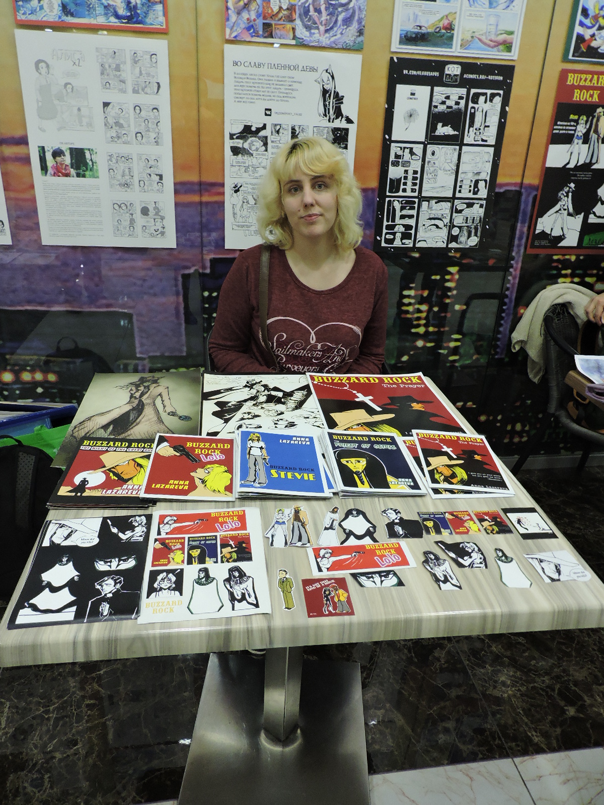 Первое, о чем хотелось бы рассказать — аллея авторов, которая оставила самые лучшие впечатления и с которой я увезла большую стопку комиксов. Ольга Федотова очень заинтересовала как комиксом «Тропа дворфов», написанным в соавторстве с Наташей Соло, так и сольными работами «Собачьи хлопоты» и «Кактус». «Тропа дварфов» представляет собой фэнтези-историю из трех выпусков, небольшую, но с забавными героями и хорошим сюжетом. Настя Стриж — автор из Казани, и если вы читали мой отчет о Плутоне, то именно она нарисовала мне Капитана Америка. В рамках этого фестиваля приобрела у нее несколько открыток. Варвара Леднёва — автор, прежде всего заинтересовавшая комиксами по эвенкийским сказками и легендам (я очень люблю такое), а после более подробного знакомства с ее работами, я приобрела несколько открыток и комикс «Москва космическая», рассказывающий о местах в Москве, связанных с космосом с указанием адресов и метро. Анна Лазарева — организатор фестиваля и автор серии комиксов о городке Buzzard Rock. Творческое объединение «Бренник-Артс» уже было мне известно по циклу «Chapiteau. Одним богом больше» и комиксам «Дети похмелья» и «Наказание», была рада увидеться с авторами лично. Также на аллее авторов располагалась и небольшая выставка работ.