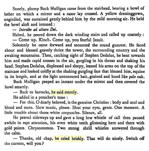 Я чуть выделил авторский текст внутри реплик, иначе его недолго и пропустить при поверхностном взгляде. Именно так, насколько можно судить, диалоги оформлены по всему «Улиссу».