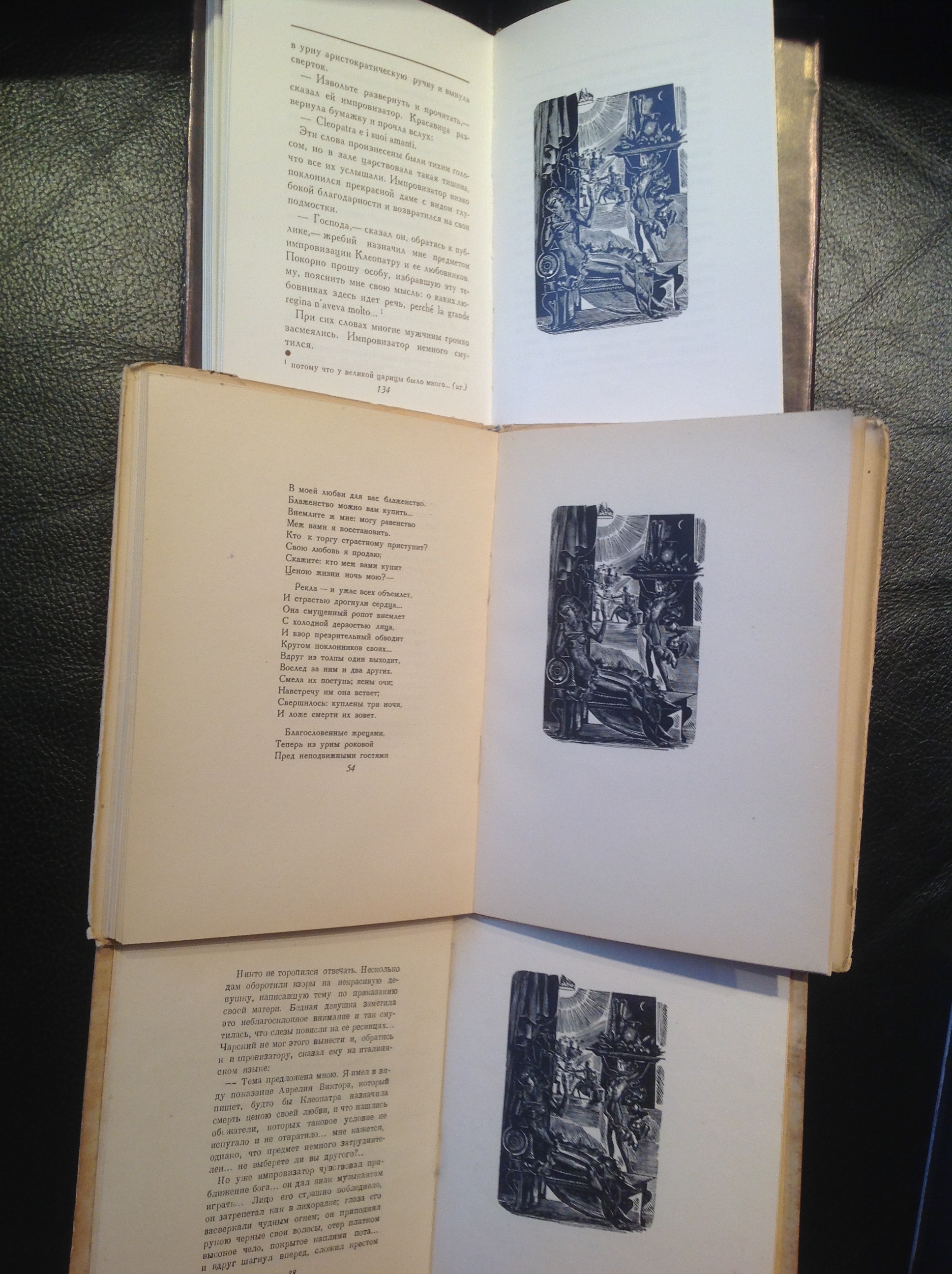 Отличия-то есть, и странно, что их каталог-справочник иллюстрированной пушкинианы не отразил. Если в изданиях 1934 г. и 1936 г. немного отличается комбинация иллюстраций (картинка на авантитуле в издании 1934 г. помещена в тексте в издании 1936 г.), то в издании 1981 г. имеется новая иллюстрация с Клеопатрой (на авантитуле), которой не было в книгах тридцатых годов. Ну, у Кравченко имелось, как это часто бывает, несколько отвергнутых вариантов. С Клеопатрой полный набор теперь есть в трёх книгах. Только в альбоме остался полный набор сцен небесного вдохновения импровизатора.