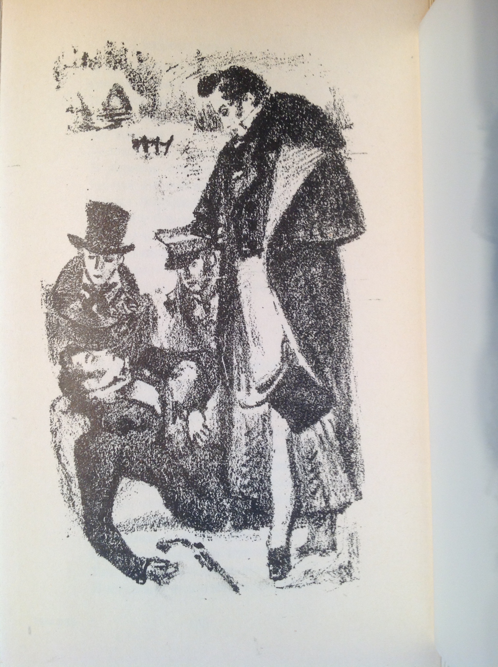 Есть сюжеты с разным решением. Вот Онегин и Ленский. В 1937 году им была посвящена одна из немногих страничных иллюстраций. А в 1946 году им досталась только заставка.