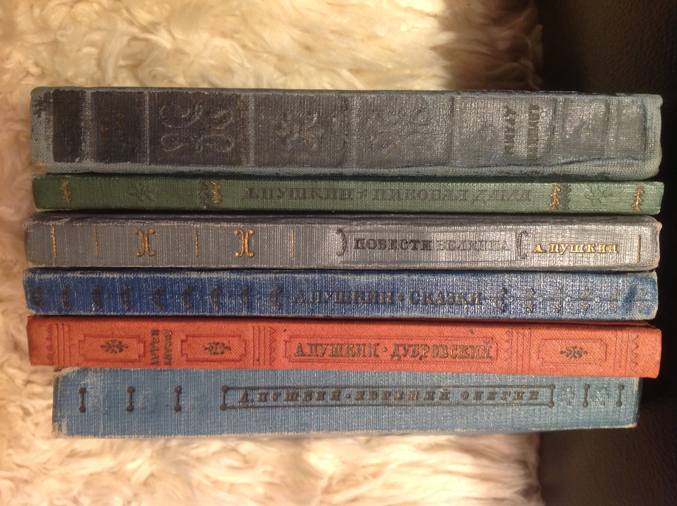 В общем, пришлось срочно искать и покупать раннего «Онегина». Издание 1936 года в Детгизе почему-то редкое (как-нибудь потом доберусь до него). Выбор пал на издание 1937 года. Повезло — на Алибе было недорогое предложение за 300 рублей (+ доставка 150 рублей, увы!). И, видимо, на этот раз не прогадал — книга 1937 года оказалась изящным томиком. И даже более того — из серии, которую я окрестил «ленинградской юбилейной» (1936-1937). Это неофициально: единого оформления нет — у книг переплёты разного цвета и разные узоры на переплётах .