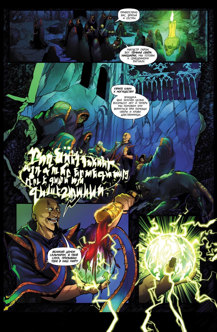 Не знавший долгое время бед и страданий мир Краеземья содрогнётся. Спустя восемь веков проведенных в изгнании, благодаря своим тёмным приспешникам, вернулся он! Тот, чьё имя вселяет страх в сердца самых смелых воинов, чьё могущество не знает границ, чей образ является в кошмарах даже бессмертным. Жители Краеземья (это как Средиземье, только с краешку) хорошо запомнили те жуткие события, произошедшие восемьсот лет назад. Леденящие кровь сказания передавались из поколения в поколение, преумножая тёмную славу демона среди населения. Тогда он пытался захватить и поработить мир, но был побеждён. Теперь он изменил свои взгляды и вместе со своим верным слугой начнёт всё сначала. Что сулит возвращение Владыки Сальмарона известно лишь немногим... Формат: сингл, 160x250 мм Количество страниц: 32 График выхода: ежемесячно Первый выпуск появится на полках магазинов уже в январе!