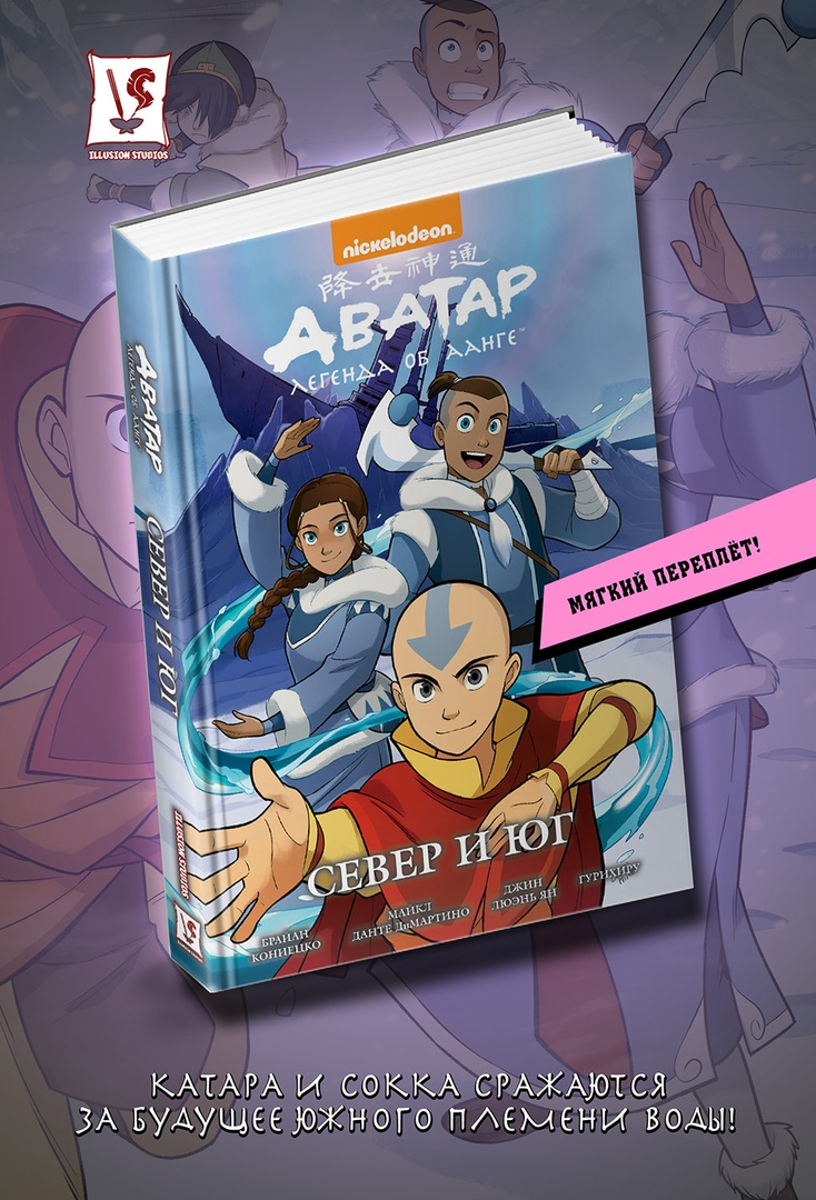 В то время, как Аанг помогает Зуко с Кемурикаге, Катара и Сокка отправляются на родину. Катара с удивлением обнаруживает, что их любимая деревня превратилась в крупный город, возглавляемый не иначе как её отцом! Северянка по имени Малина, судя по всему, оказывает немалое влияние на отца и призывает к объединению двух племён, в то время как южанин Гилак организовал повстанческое движение, чтобы остановить её любой ценой. Последней каплей становится заявление Малины о начале сотрудничества Южного племени с компанией отца Тоф Бейфонг, и вспыхивает восстание! Заслуженный лауреат премии «Айзнера» Джин Люэнь Ян и команда художниц «Гурихиру» завершают свой грандиозный цикл книг финальным аккордом! Издание будет включать все три части истории «Север и юг», а также галерею набросков и рабочих иллюстраций! Впервые на русском языке! По традиции, Книга выйдет одновременно в двух вариантах, в мягком и твёрдом переплёте, с различными иллюстрациями на обложках. Издание в твёрдом переплёте будет в свободном предзаказе на сайте ILLUSIONSHOP.RU c 24.12.2018 по 21.01.2019, ограниченное количество экземпляров будет распространяться через специализированные комикс-шопы (в соотношении 1:4). Твёрдый (16,5х25 см) или мягкий (16х24см) переплёт, матовая обложка, мелованная бумага, 240 страниц. При оформлении предзаказа на любое издание вы ГАРАНТИРОВАННО получите комплект из трёх открыток с вариантами обложек! При заказе двух вариантов — 4 различных открытки. НО И ЭТО НЕ ВСЁ! Мы дарим всем, кто предзакажет книгу, крутой постер! РЕЛИЗ КНИГИ: Февраль 2019