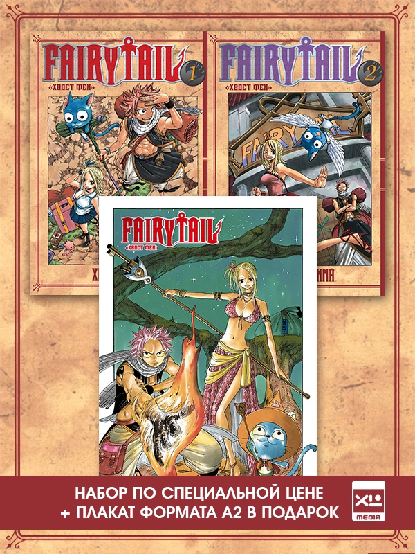 Также вы можете заказать собрание из двух томов манги по специальной цене. Кроме того, при заказе такого собрания вы получите красочный плакат формата А2 от издательства в подарок! Ожидаемое время поступления – конец февраля. Хвост Феи. Том 1. Что такое магическая гильдия? Это место, где волшебник может найти работу, причем это может быть как банальный поиск потерянной вещи, так и борьба с демонами. Девушка по имени Люси, которая стремится стать взрослой уважаемой волшебницей, знакомится с Нацу, магом, повелевающим огнем, и он приглашает ее в свою гильдию, да не в обычную, а в ту самую, которой Люси давно восхищается — «Хвост Феи»! Правда, похоже, что маги в «Хвосте Феи» — сплошь чокнутые чудаки, да и задания тут дают довольно опасные… Хвост Феи. Том 2. Люси, маг Звездных духов, попавшая в гильдию «Хвост феи», ближе знакомится с новыми товарищами: огненным магом Нацу, котом Хэппи, эксгибиционистом Греем, бабником Локи, пьяницей Каной и другими веселыми чудаками. Поскольку с Нацу и Хэппи она уже успела сдружиться, они объединяются в команду. Вместе они берутся за задание, которое выглядит довольно просто: всего-то и надо, что украсть какую-то книгу… Только вот почему за эту работу предлагают целых двести тысяч самоцветов?!
