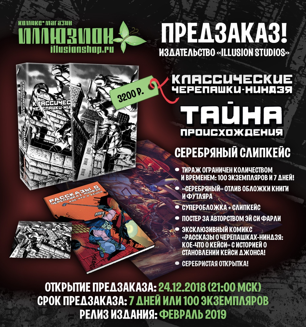 Новое оформление обычного издания, ULTIMATE-обложка для всех, кто ждал и надеялся... И, конечно же, слипкейс (о котором подробнее будет в следующем сообщении, ровно через час)! Книга содержит 416 страниц и десять выпусков: TMNT Vol.1 #1-7, микро-серии «Рафаэль», «Фуджитоид» и «Микеланджело»! Книга появится на прилавках комикс-шопов и книжных магазинов в феврале! Предзаказ на ULTIMATE-издание будет неограниченно доступно к предзаказу до 21.01.2019. Остаток тиража в ограниченном количестве поступит в комикс-шопы (в соотношении 1:4). При оформлении предзаказа вы гарантированно получите постер и открытку с иллюстрацией обложки выбранного варианта!