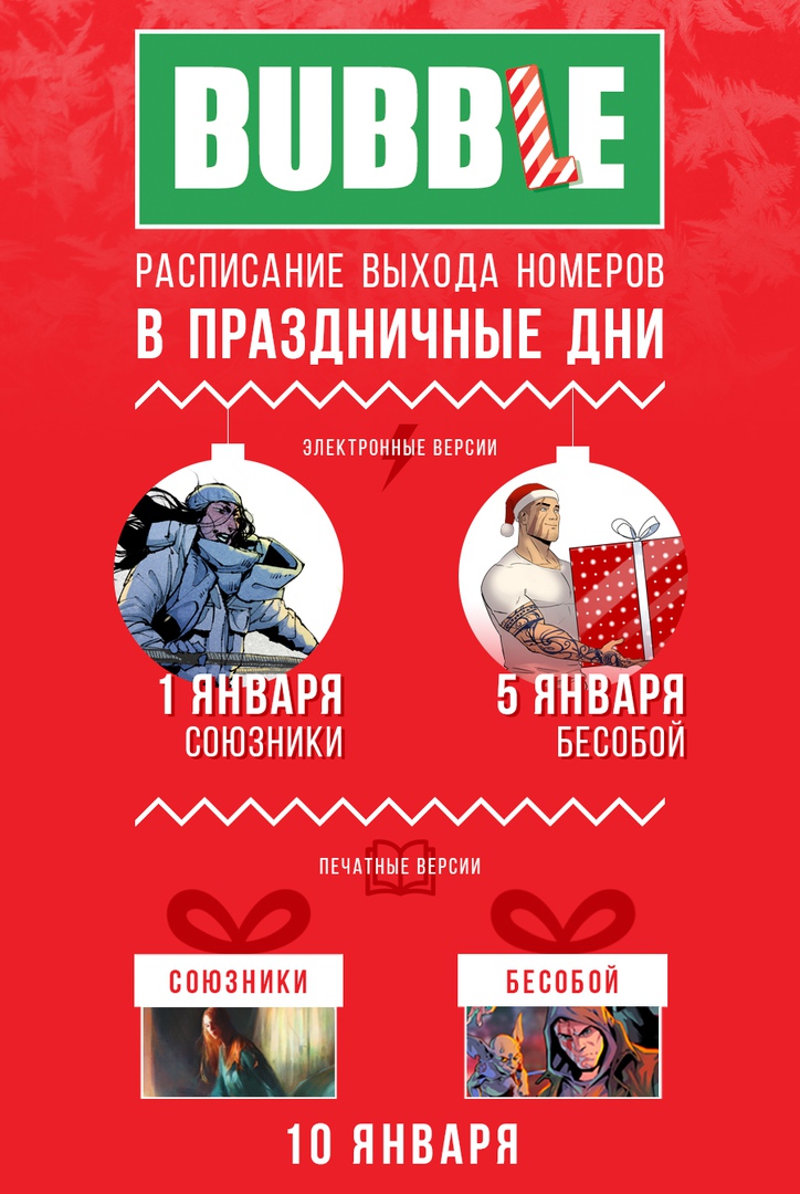 На прошедшем в субботу мероприятии издательство BUBBLE объявило о закрытии серий «Крутиксы», «Экслибриум» и «Метеора», вышедшие на этой неделе выпуски станут последними. По словам издателя, перезапуски не планируются, ждём подробностей. А также издательство рассказало о графике выхода комиксов в праздничные дни.