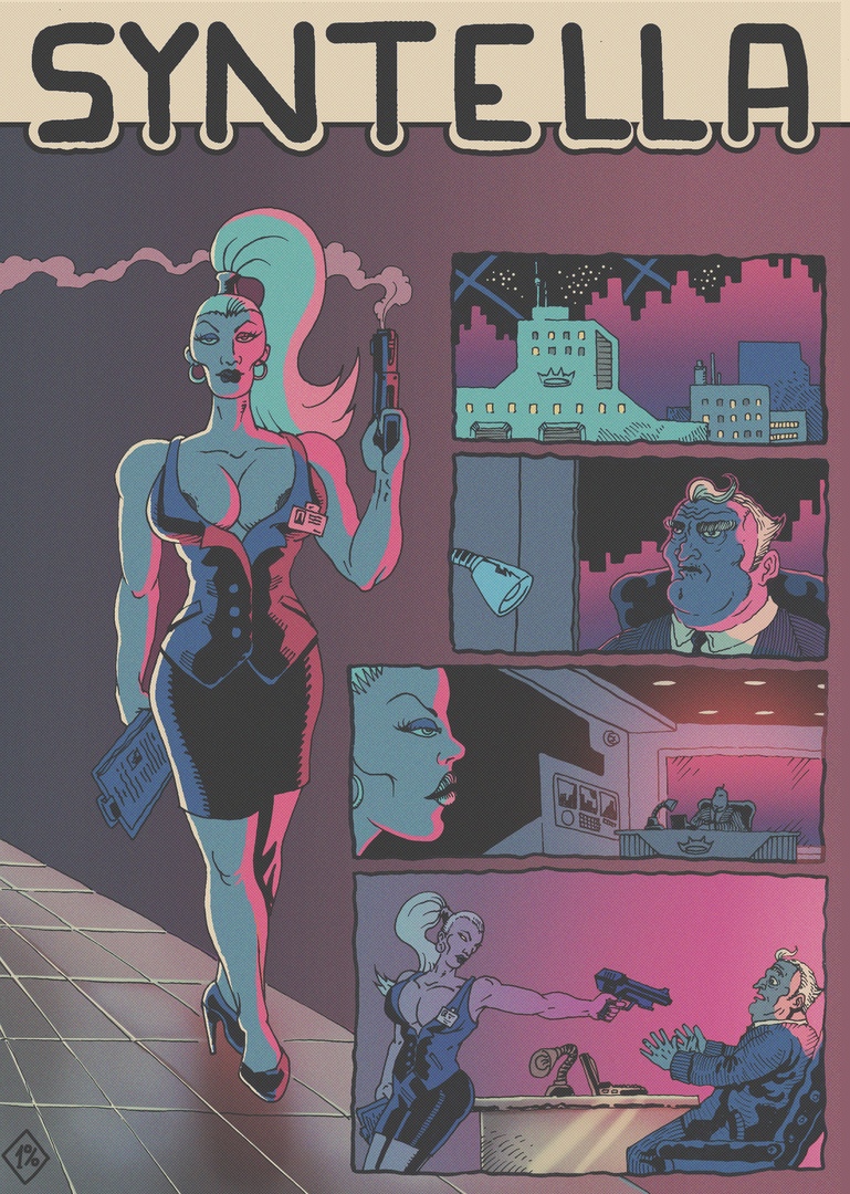 Подготавливаем Синтеллу к печати. Для тех, кто не в курсе, поясню — это такой комикс про злобную женщину-киборга, которая жестоко истребляет мутантов, роботов-убийц, космических рестлеров и прочих веселых ребят. Она — наемная убийца, которая, сама того не сознавая, завладела главной тайной Космоса — Первичным кодом, с помощью которого древние кибер-боги спроектировали Вселенную. В общем, там много драк и ненаучной фантастики. И роботов. И насилия. Теперь — всё в цвете.