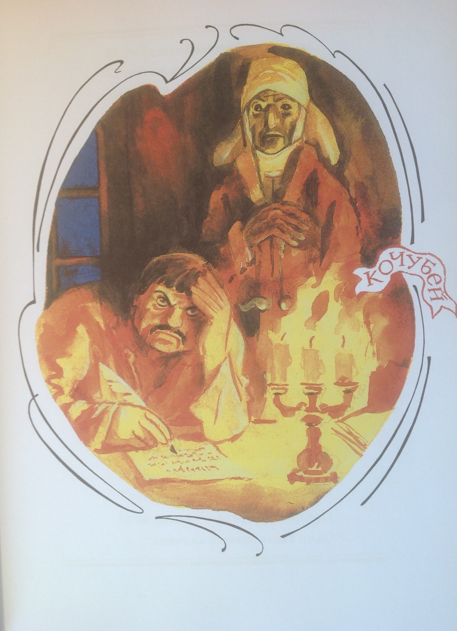 Кочубей у большинства иллюстраторов представлен этаким страдальцем за общерусское дело. У Перцова по-иному. Он, как и все художники, рисует Кочубея в момент написания доноса царю на Мазепу. Но показывает Кочубея без прикрас: дело-то было неблаговидное, поводом к политическому доносу (верному по существу) послужило отнюдь не радение об интересах Империи, а личная обида и неспособность регионального олигарха отомстить царскому полпреду. Тут художник точно раскрывает мотивы Кочубея и намекает на весь этот клубок змей, боровшихся за влияние на Украине.