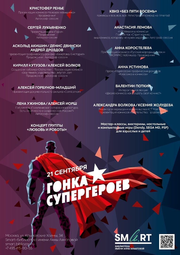 21 сентября 2019 г. с 12:00 до 22:00 в библиотеке им. А. Ахматовой (Москва, улица Крылатские холмы, 34) пройдёт фестиваль комиксов «Гонка супергероев». Вход бесплатный!