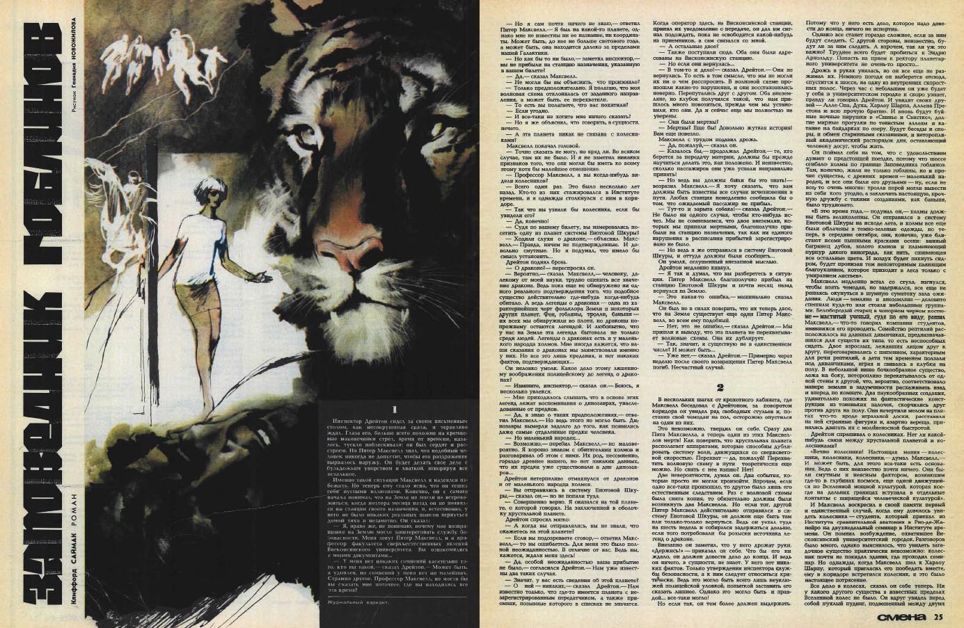 Роберт Шекли «Трудности охоты» — в «Смене» № 14 за 1976 год публиковался перевод Александра Санина «Проблемы охоты», в сборнике же помещен вариант перевода Баканова и Бабенко «Трудности охоты». Пляски начинаются с картинкой. В журнале она узкая и длинная, на разворот. В книге ее разрезали, часть поместили на нечетной странице 369, с уменьшением масштаба, а вторую часть — надо перелистнуть страницу, там на странице 370 и окажется вторая часть рисунка, и с относительным увеличением в три раза против первой части.