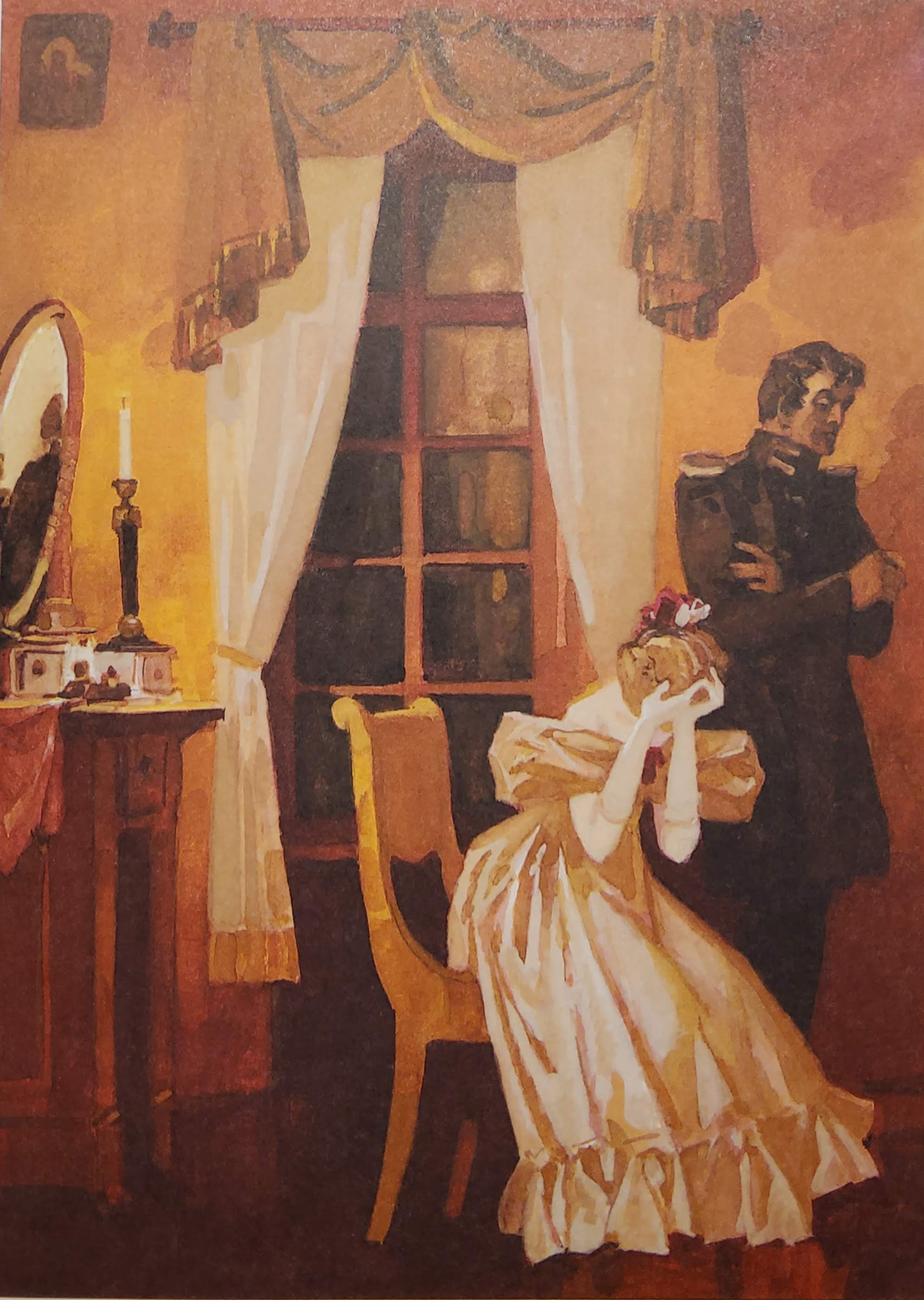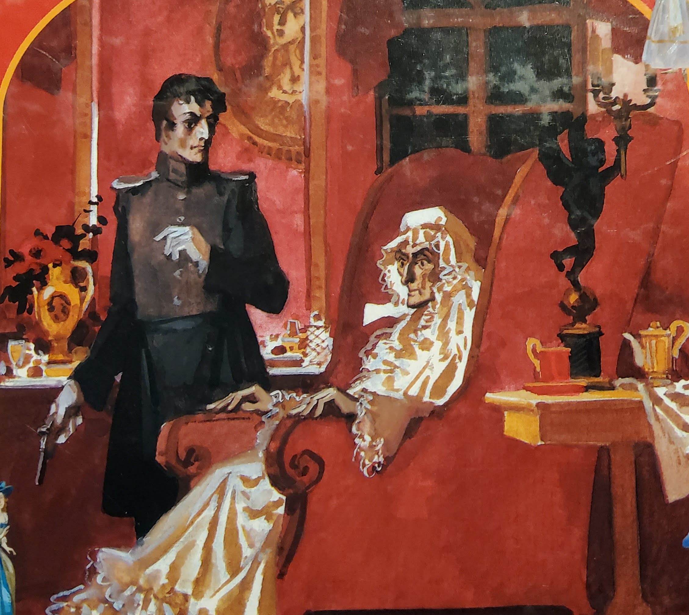 Традиционная мизансцена, неоднократно встречавшаяся у разных художников. Ну разве что Германн на подоконнике не сидит.