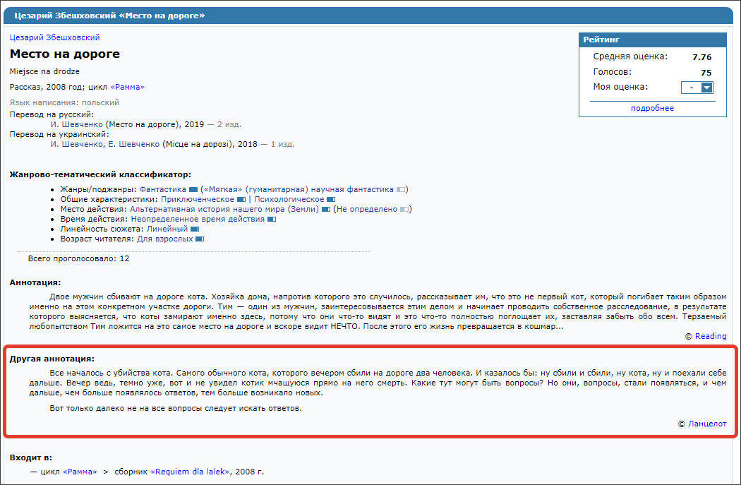 Во-вторых, теперь у произведения может быть несколько аннотаций. Одна основная и сколько угодно альтернативных. Так что если увидите ссылку «предложить свою аннотацию», не проходите мимо. За них также начисляются баллы.
