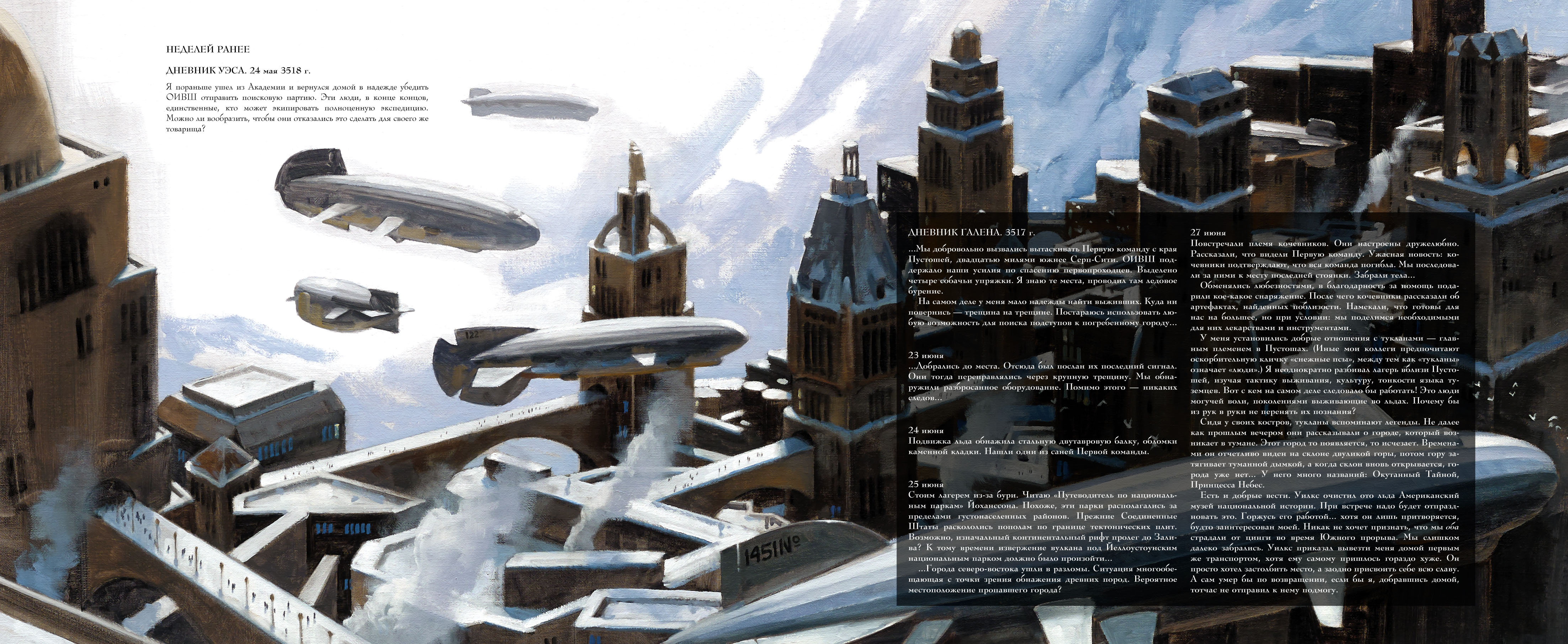 цитатаГород, погребённый во льдах. Одержимый исследователь, затерявшийся в белом безмолвии. Сын, в одиночку разыскивающий отца... где-то над границей лесов.Гален Синглтон, знаменитый исследователь из Общества изучения высоких широт, пропал в Морозной Пустоши. Его сын Уэс, выросший в разлуке с отцом, задался целью его отыскать. Вот уже шесть месяцев минуло с тех пор, как исчез воздушный корабль Галена «Неукротимый», а Уэс получил шифрованную записку.