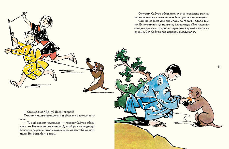 Антимоновой для иллюстрирования была предоставлена целая книжка-картинка. Она могла не торопясь идти вслед за текстом. Художница не пренебрегала возможностью отразить японскую экзотику (в нарядах, преимущественно).