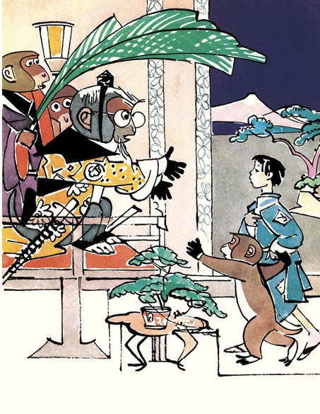 Это японская версия «Волшебного кольца». Мальчик на последние деньги выкупает приговорённого к утоплению кота. Потом собаку. Потом обезьянку. Обезьянка оказывается внуком царя обезьян. В награду мальчик получает волшебную монету. Нехороший сосед выманивает монету у простодушного мальчика. Кот и пёс выручают монету, но на обратном пути ссорятся. Монета попадает в реку, потом в живот рыбы, потом возвращается мальчику. Всё как у нас. Даже и концовка та же: пути кошек и собак разошлись. Отличие от русской сказки — в морализаторстве. Мальчик произносит речь, обращаясь к коту и собаке: