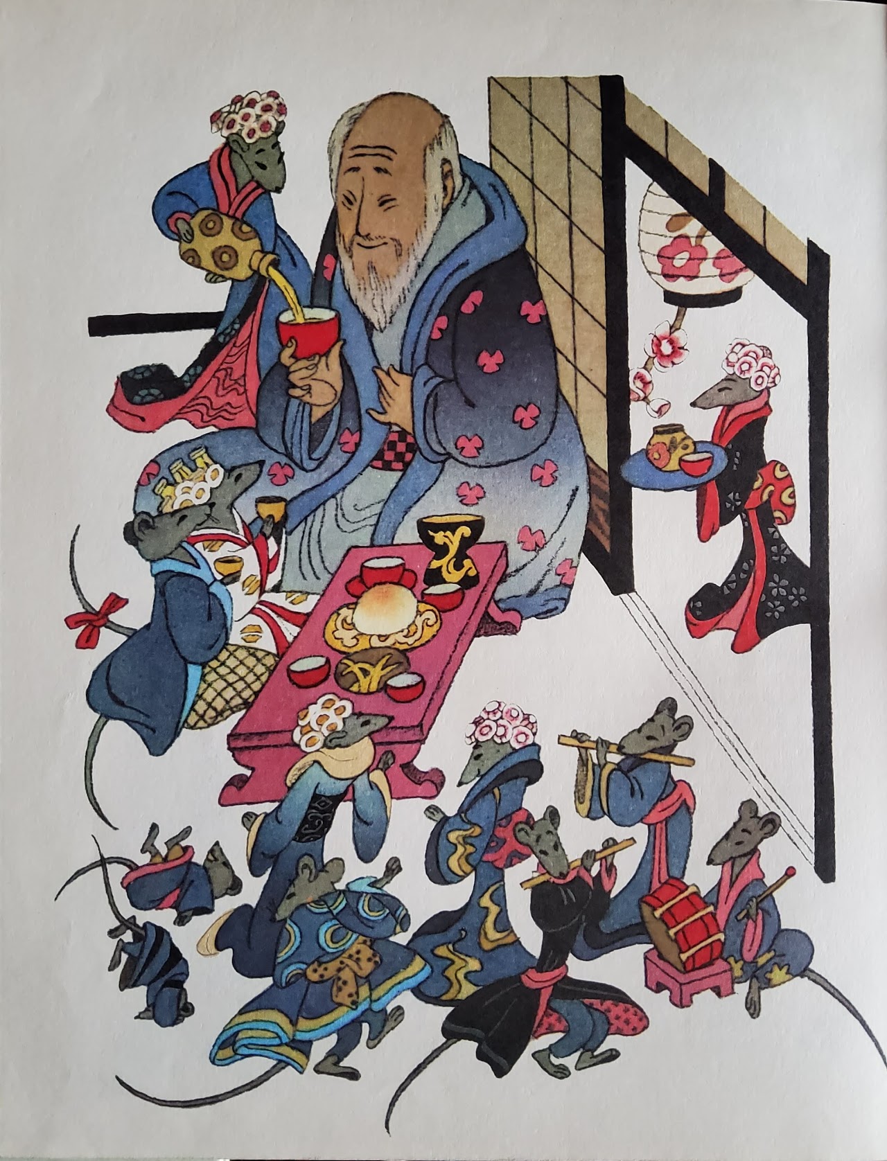Он немного отразил бытовую сторону сказки: сделал несколько иллюстраций, посвящённых собственно японцам. Старичков-соседей с шишками нарисовал, понятно.