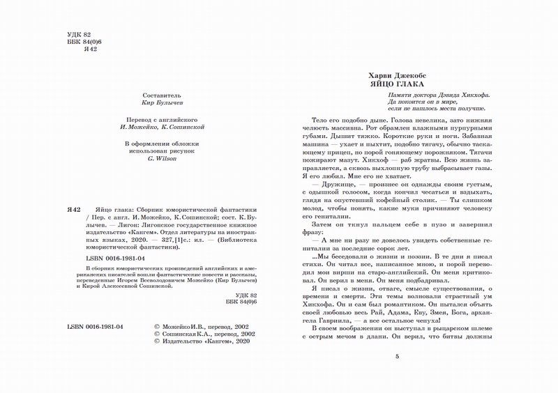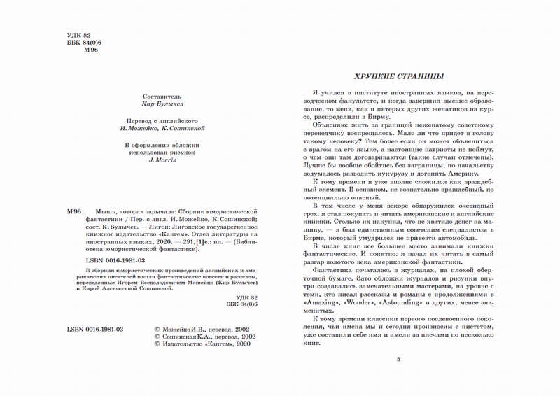 В начале 2000-х одним из центральных издательств было задумано выпустить в серии «Библиотека юмористической фантастики» два тома фантастических повестей и рассказов английских и американских писателей, целиком составленных из переводов Кира Булычева и Киры Сошинской. Кир Булычев по такому случаю даже написал оригинальное предисловие. (Оно было опубликовано несколько лет назад в одной из книг, входящих в созданную им самим серию «Для узкого круга».) Но, к сожалению, задуманный двухтомник по вполне понятным причинам так и не вышел. Пачки машинописных страничек с текстами переводов остались пылиться на книжных полках дома у переводчиков. Прошло почти два десятилетия, и снова «во исполнение программы переноса электронных текстов в бумажные книги...» (см. предыдущее сообщение), Кирой Сошинской, автором выполненных переводов и наследницей переводов Кира Булычева, было принято решение реализовать несостоявшийся проект, пусть и не массовым тиражом, но доступным хотя бы для самого узкого круга читателей и почитателей. В итоге некий «издатель» откликнулся на это предложение, и пилотный тираж книг готов. Их состав остался таким, каким и был задуман когда-то двумя Кирами — Булычевым и Сошинской.