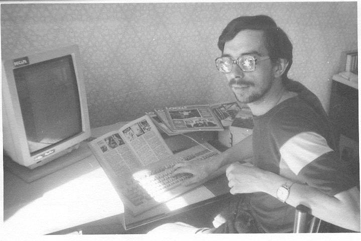 А вот этот снимок был сделан как раз в тот период, когда я делал то ли 4-й (1993), то ли уже 5-й (1994) номер «Интеркома». Сразу видно, что тут мы уже съехали из Пулковской обсерватории, где ТФ базировалась в 1990-1992 годах, потому что это уже явно штаб-квартира «Терры Фантастики» на Вознесенском проспекте (бывший проспект Майорова) — у нас тогда как раз появилась пара-тройка специальных вертикальных мониторов (довольно дорогих, кстати), при помощи которых было очень удобно верстать страницы в программе «Вентура Паблишер» (и особенно, если это сложная журнальная вёрстка), — и один из таких мониторов я тогда на время прибрал себе — специально для работы над журналом. Книги-то я, в принципе, не верстал — это была не моя штатная специальность. Моя специальность была — литературный и ответственный редактор. И единственная книга, которую я смастерил целиком и полностью — и как редактор, и как верстальщик (технический редактор), и даже как художественный редактор, — это был небезызвестный сборник эссе Сергея Переслегина «Око тайфуна». Однако верстать я всё равно любил, хоть и был непрофессионалом, поэтому оттягивался на своем личном журнале. Кто понимает толк в вёрстке, тот подтвердит, что в «Интеркоме» вёрстка довольно непростая, со множеством «загогулин», и особенно если делать её в «Вентуре», а не в «Пейджмейкере» (который, кстати, я так и не освоил толком, хотя журнал «Если», куда я перешел накануне 1995 года, чтобы делать там «интеркомовскую» вкладку — «журнал в журнале», верстался именно в «Пейджмейкере». Но в «Если» я проработал недолго, всего год-полтора, да и верстать мне там особо не пришлось, — я просто привозил туда свой готовый макет вкладки, свёрстанный в «Вентуре» и отпечатанный на принтере, плюс файлы всех текстов и картинок на дискетах, а «есливский» техред, ориентируясь по моему бумажному макету, перевёрстывал его заново в «Пейджмейкере» и вставлял вкладку в готовый номер.