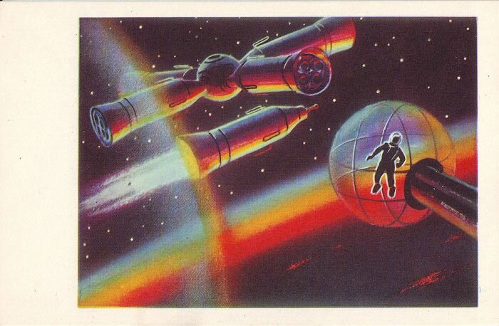 11 открыток. Фантастики к сожалению тут нет, только две можно с некоторой долей отнести к фантастике — где космонавты летят среди звезд без корабля («В открытом космосе» и «В полете»).
