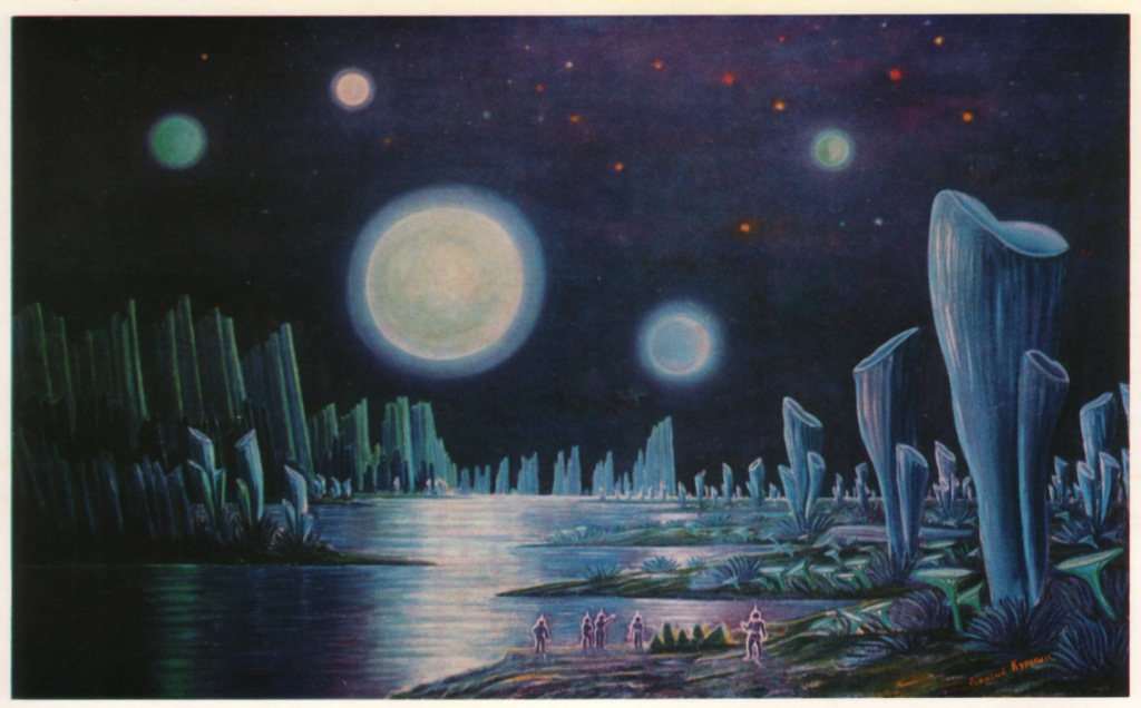 16 открыток с репродукциями картин Г. Курнина (1915-1988). Всё — фантастика. Но какая-то однообразно полосатая политра. Больше всего понравилась «Планета с пятью лунами»