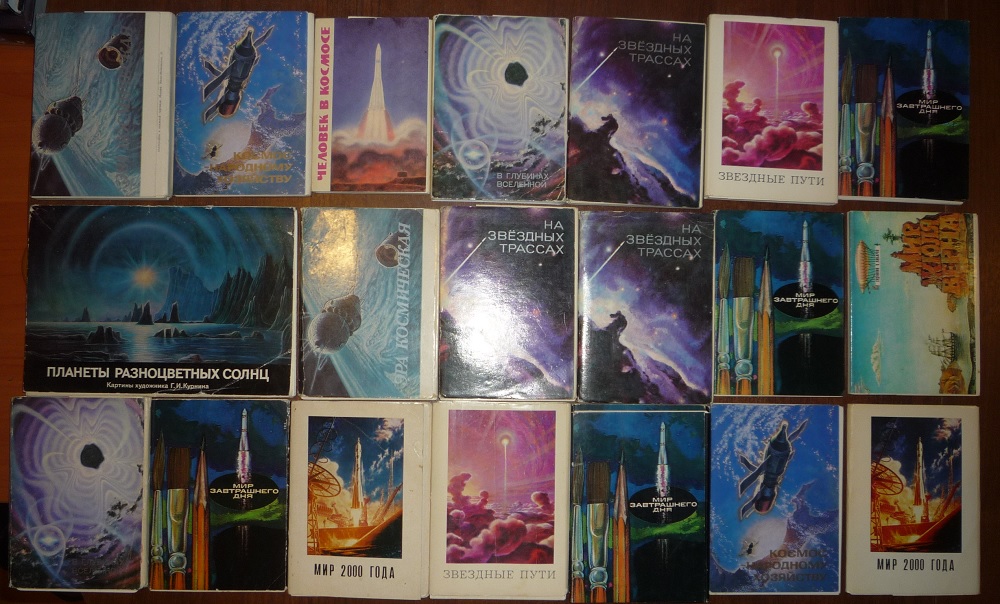В 1960е в наборах открыток о космосе очень мало настоящих изображений реальной космической техники и аппаратов, всё — фантастика ближнего и дальнего прицела, освоение фронтира на Луне и Марсе, далёких звезд и даже галактик. Бурлеск и полёт фантазии. В 1980е доля фантастики снижается до шести, пяти, даже двух открыточек на весь комплект. И упомянутые наборы по фэнтезийным сюжетам («Заповедник гоблинов» и картины Вальехо), изданные в самом начале 1990-х, показывают что они не изменили тренд, а лишь следовали общему вектору отката от технологического освоения окружающего мира.