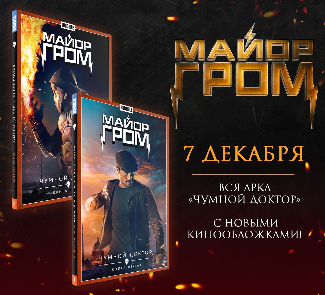 Издательство BUBBLE выпустит комиксы «Майор Гром. Том 1. Чумной Доктор. Книга 1» и «Майор Гром. Том 2. Чумной Доктор. Книга 2» с кинообложками.