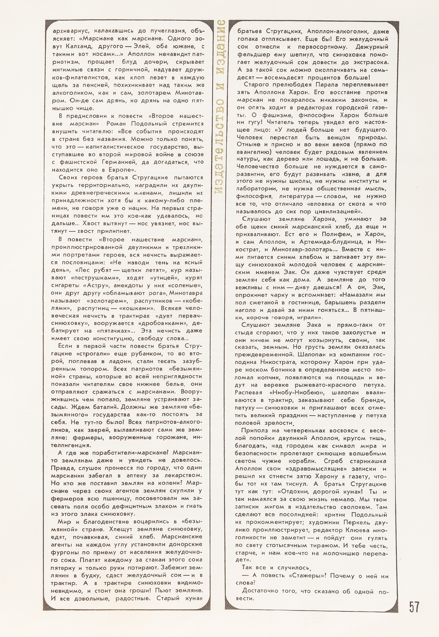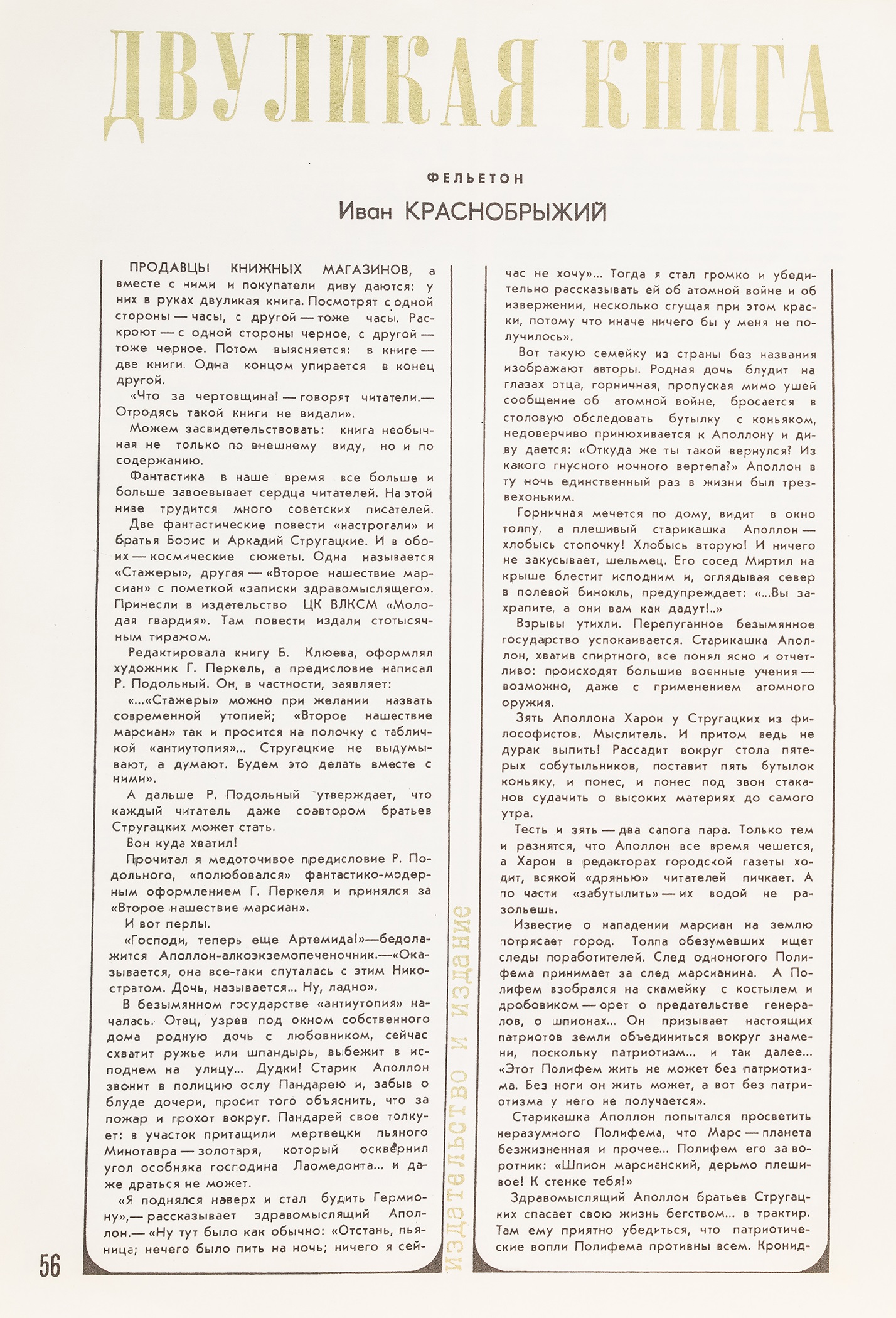 Не реклама и не нагоняй. Ибо народ читал «Знание-Силу» или «Науку и Жизнь», а «Журналист» — узкое издание. Посему нормальный читатель гонялся за книгой. И вообще «Писатель пописывает, критик побрехивает, а читатель на него поплевывает». Краснобрыжему «заказали» Стругацких — ну на кой фиг ему из «Адыгеи» сдался АБС. Но народ подрабатывал предисловиями и статейками. Так Краснобрыжий обессмертил свою фамилию А то бы