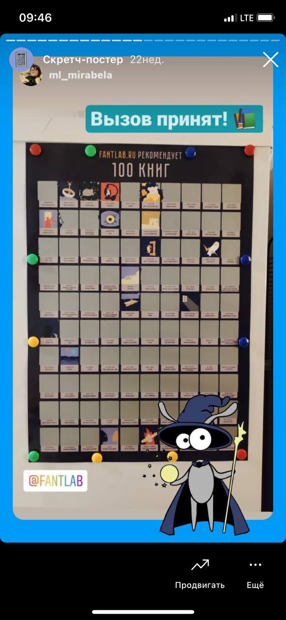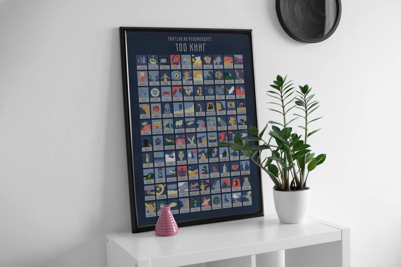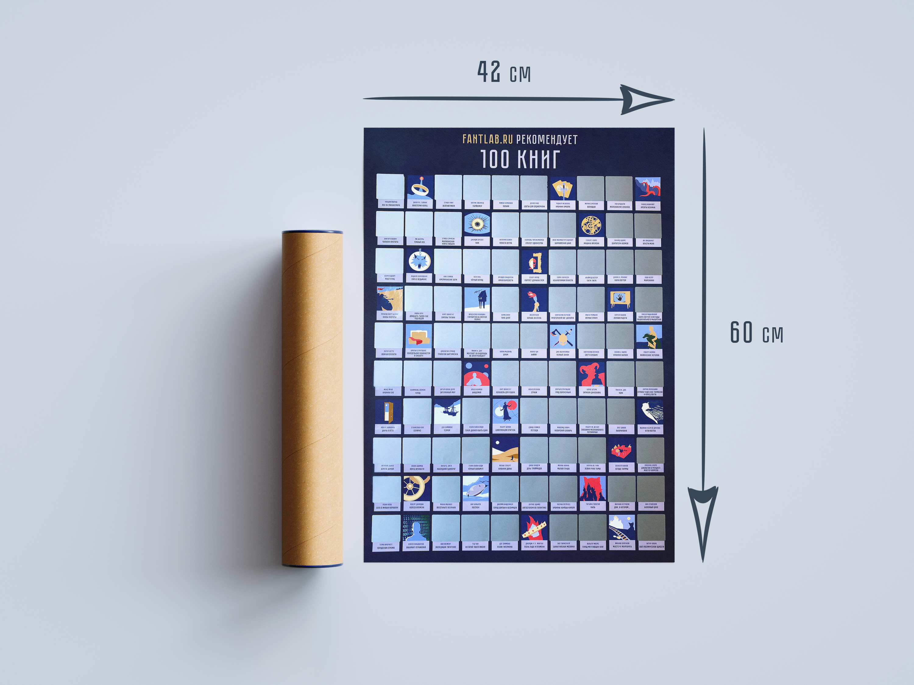 Представляем наше творение — скретч-постер «FantLab.ru рекомендует 100 книг». На постере — сто произведений (романы и циклы) в виде ассоциативной иллюстрации к произведению и заголовка. Все иллюстрации скрыты серебристым напылением, который следует стирать только у прочитанных вами произведений. Закрытые, нестёртые квадратики на постере служат мотиватором к прочтению.