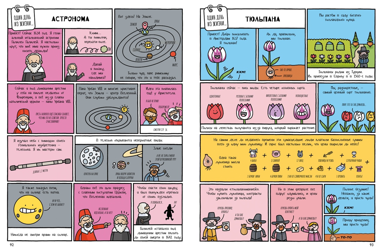 Неслучайно это именно комикс: так прямая речь персонажей звучит ярче, индивидуальнее, а рассказ становится наглядным и близким. Если захочется узнать об эпохе подробнее, достаточно открыть рубрику «Крупным планом», а «Краткие новости» поведают о том, что ещё происходило в мире в это же время.