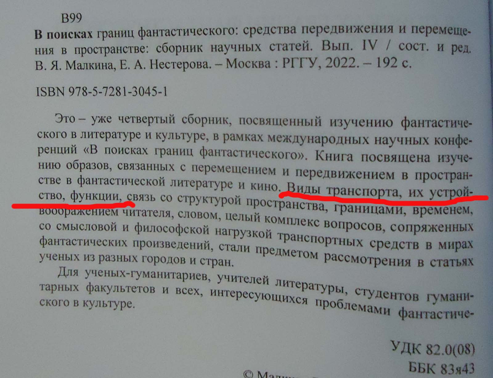 В РГГУ вышел сборник статей В поисках границ фантастического: средства передвижения и перемещения в пространстве, Составители В.Я. Малкина, Е.А. Нестерова. М.: Российский государственный гуманитарный университет, 2022 г., ISBN 978-5-7281-3045-1, тираж 300 экземпляров, мягкая обложка, на Алибе 1450 руб., может еще где-то всплывёт.