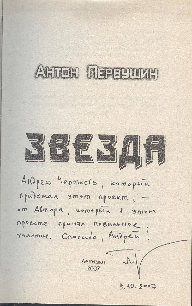 На самом деле во время того визита в больницу Антон Первушин подарил мне не одну свою книгу, а сразу две. Одна — научно-популярная, про Луну, а вторая — научно-фантастическая. И не просто НФ, а роман, написанный в русле некоего литературно-издательского проекта, который ВПЧ (то бишь Ваш Покорный Чертков) задумал еще в 2002 году. Этот проект должен был называться «Новый советский детектив» и включать в себя книги, написанные в манере советских детективов и боевиков (типа Аркадия Адамова и братьев Вайнеров), а действие их должно было происходить в альтернативном, т.е. выжившем Советском Союзе 2000-х годов. К сожалению (или к счастью), этот проект по целому ряду причин я так и не сумел осуществить, однако Антон, тем не менее, свой роман таки написал и тут же издал его в издательстве Саши Сидоровича. И сразу же приволок его ко мне в больницу (вот так всё по времени совпало), где я и проглотил его в перерывах между процедурами и капельницами. Насколько мне известно, роман этот тогда очень неплохо продавался, и поэтому Антон уже несколько лет пишет то ли один, то ли даже два романа в продолжение «Звезды», но когда он их закончит, я не знаю — а он не колется...