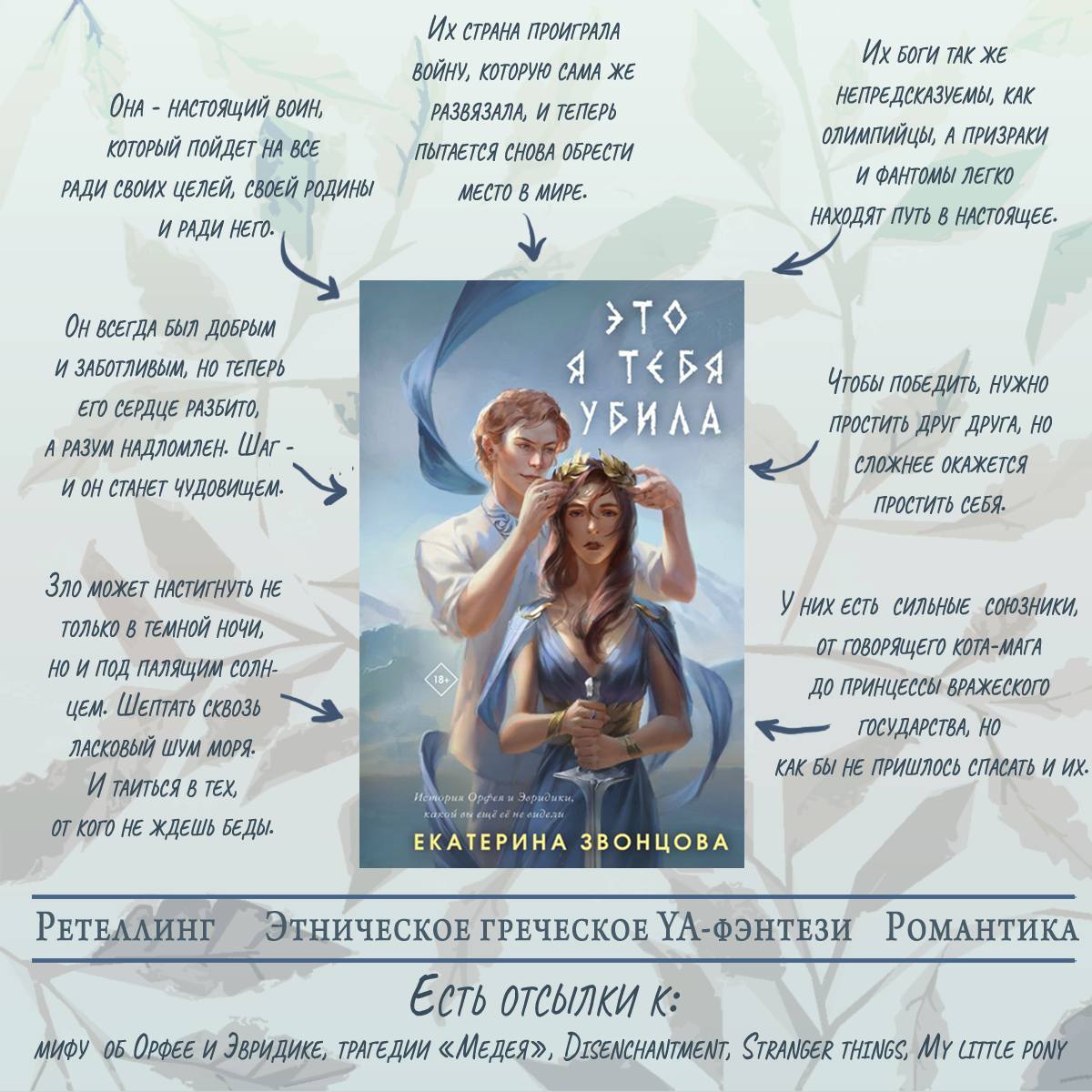 Увидел свет новый роман Екатерины Звонцовой — фэнтези «Это я тебя убила», вдохновленное мифом о Орфее и Эвридике.