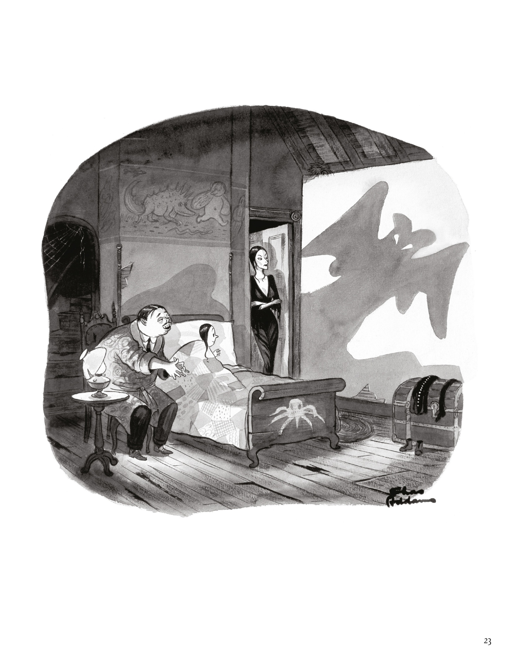 Тогда ещё безымянные, Мортиша, Ларч и Вещь дебютировали в 1938 году в журнале New Yorker. Следующие 26 лет клан обрастал плотью и кровью и множился числом в рисунках его демиурга Чарльза Аддамса. В 1964 году мрачные стиляги покорили малые экраны на телеканале ABC, а в 1991 появились и на больших.