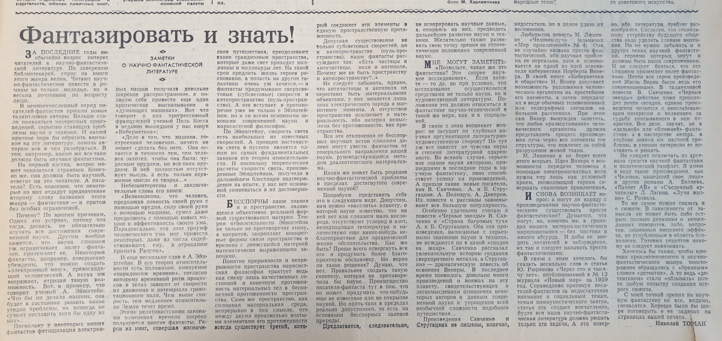 Дискуссия о фантастике 1960 года в газете «Литература и жизнь» началась статьей Николая ТОМАНА 18 декабря предыдущего 1959 года. Честно говоря, я был в сомнениях: есть ли смысл в публикации? Ведь четыре из семи (а может, даже из восьми) выступлений участников этой дискуссии вполне доступны (в частности, их напечатал в «Истории фэндома» Юрий ЗУБАКИН). Но все же обнародованы до сих пор не все высказанные тогда позиции. Поэтому считаю необходимым представить дискуссию полностью, тем более, что теперь есть возможность оснастить ее гиперссылками и читаемыми фотографиями оригиналов.