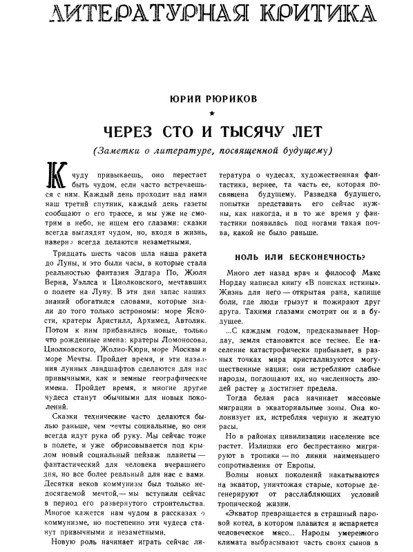 В связи с этим хотелось бы сказать несколько слов о статье Ю. Рюрикова «Через сто и тысячу лет», опубликованной в № 12 журнала «Новый мир» за 1959 год. Справедливо критикуя писателей-фантастов за недостаточное внимание к социальным темам, темам коммунистического завтра, статья эта создает впечатление, будто вся наша научно-фантастическая литература должна решать только эти задачи. А это, неверно, ибо литература требует разнообразия. Согласен, что социальному устройству будущего общества надо уделить главное внимание. Но не нужно забывать и других темах научной фантастики, героями которых могут и должны быть наши современники. И не следует бояться, что это слишком приземлит полет фантастики. Почти все герои произведений Жюль Верна были ведь его современниками. В талантливой повести В. Савченко «Черные звезды» действие тоже происходит почти сегодня, однако произведение читается с неослабевающим интересом и волнением за судьбу описываемого в нем открытия. Все дело, значит, не в «дальней» или «ближней» фантастике, а в мастерстве автора, глубине знания им научной проблемы, в умении интересно ее поставить и решить.