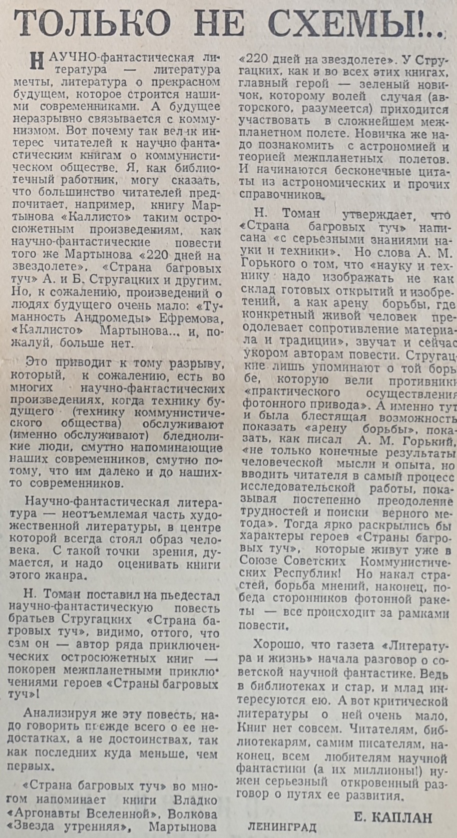 На статью Николая ТОМАНА «Фантазировать и знать!» в «Литературе и жизни» 8 января следующего 1960 года появилось сразу два отклика. Представлю их отдельно. Нижестоящая позиция библиотекаря Е. КАПЛАН – пожалуй, самое известное выступление из всей этой дискуссии. Оно не раз цитировалось, особенно рекомендация о том, что вместо межпланетных приключений братьям СТРУГАЦКИМ в «Стране багровых туч» надо было написать про борьбу сторонников и противников создания фотонной ракеты.
